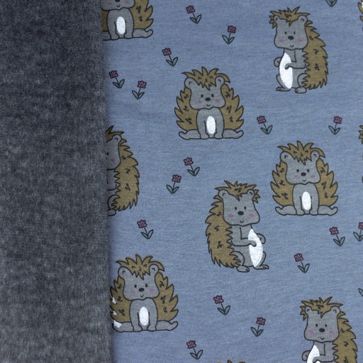 Alpenfleece Igelchen und Blumen auf Jeansblau Meliert