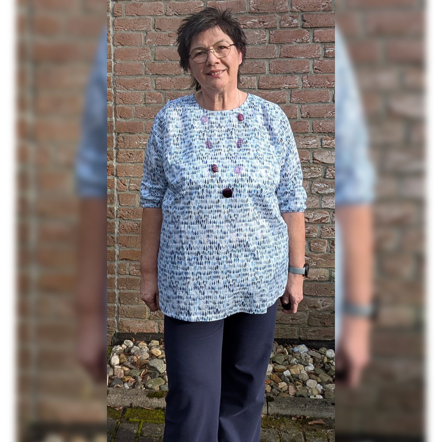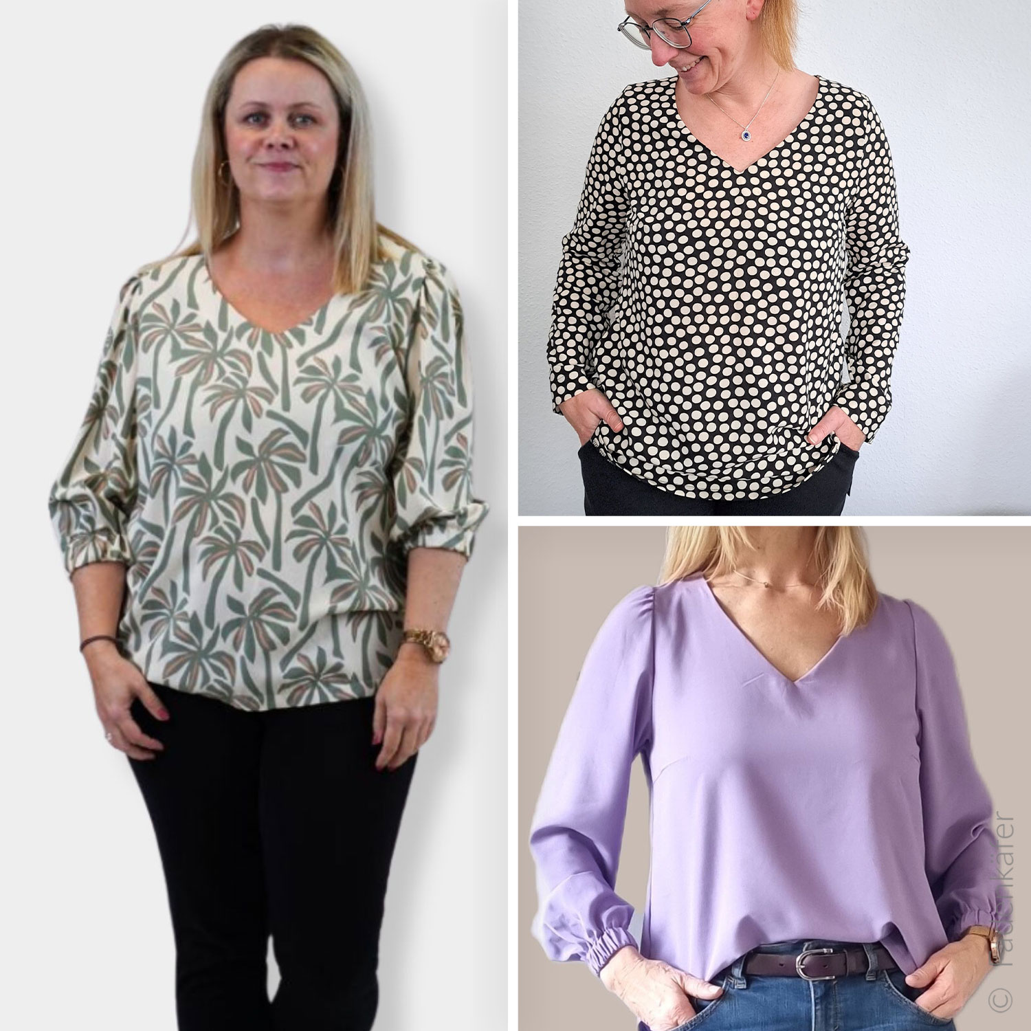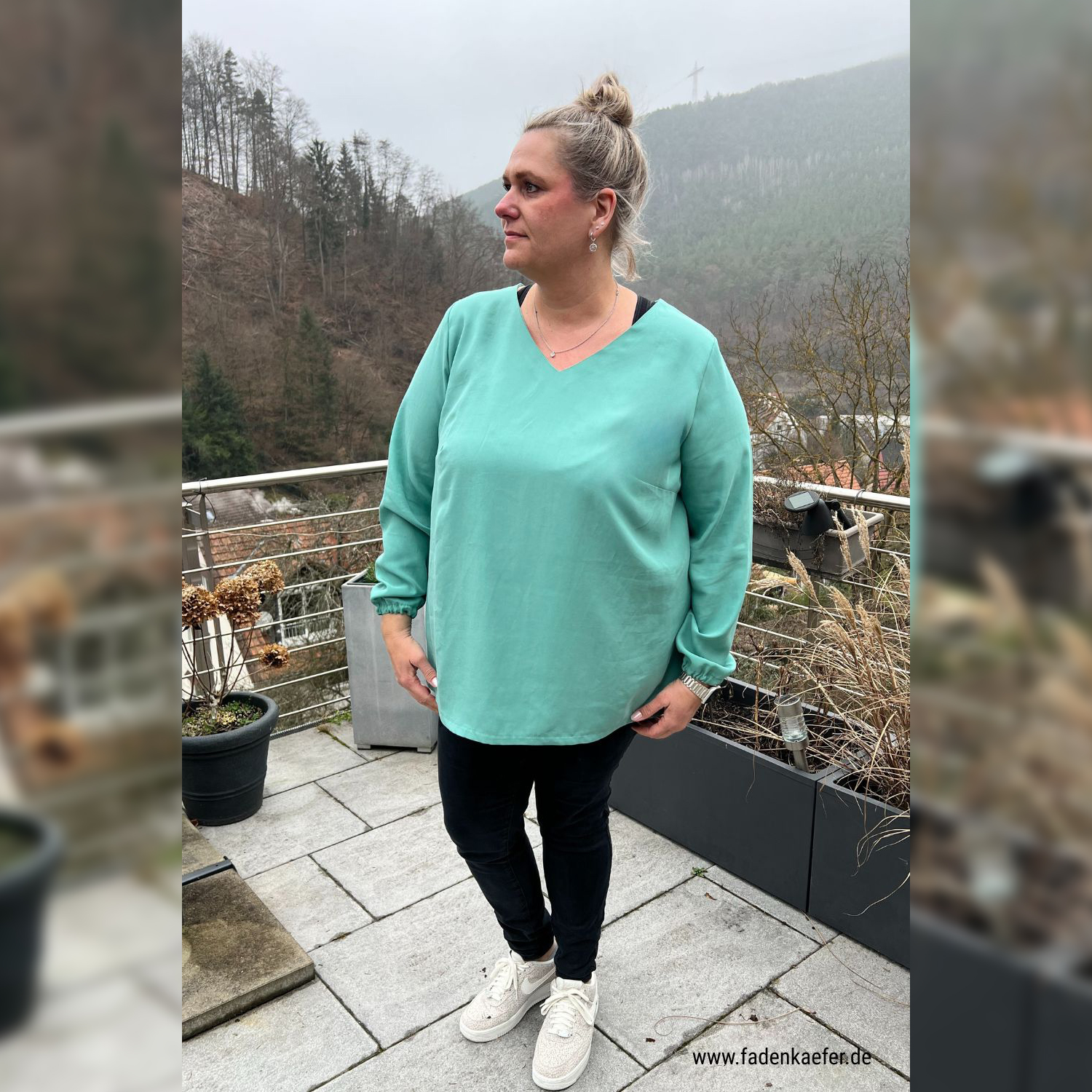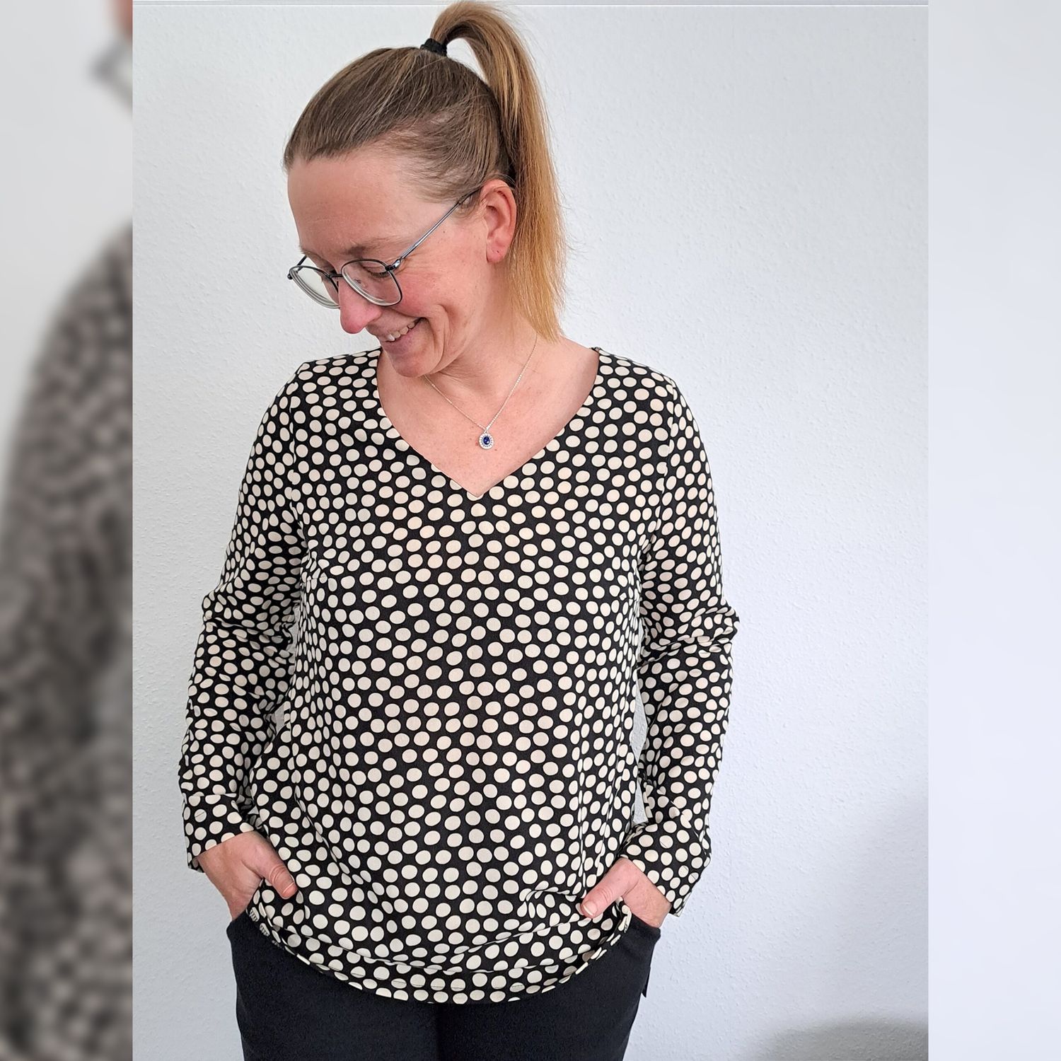 Die Basic-Bluse ist ein zeitloser Schnitt, der schnell und einfach genäht ist und sich ideal für den Alltag eignet. Du kannst zwischen einem Rundhals- oder V-Ausschnitt wählen, die jeweils mit Belegen verarbeitet werden. Die Ärmel sind in kurz, 3/4 und lang enthalten und können entweder klassisch oder mit Kräuselung in der Armkugel genäht werden, wobei wir bei der gekräuselten Variante einen Gummi im Ärmelsaum empfehlen. Der leicht abgerundete Saum im Rückenteil rundet den Schnitt harmonisch ab.