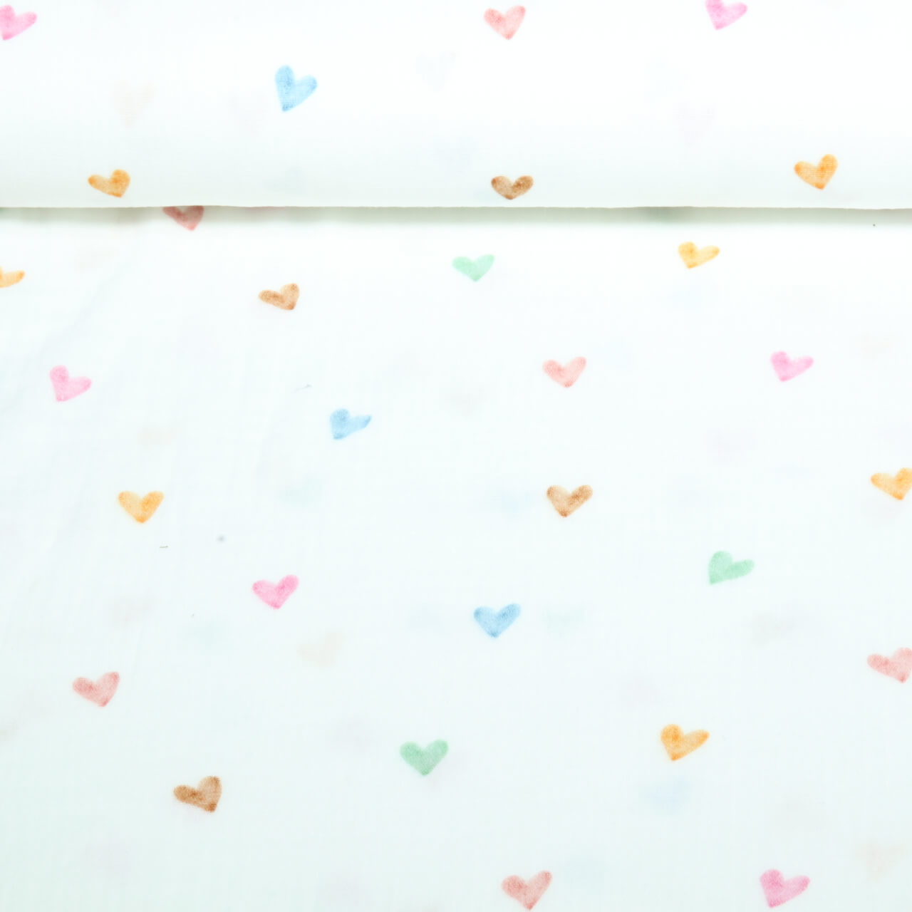 Baumwoll Musselin - Bunte Herzen Offwhite