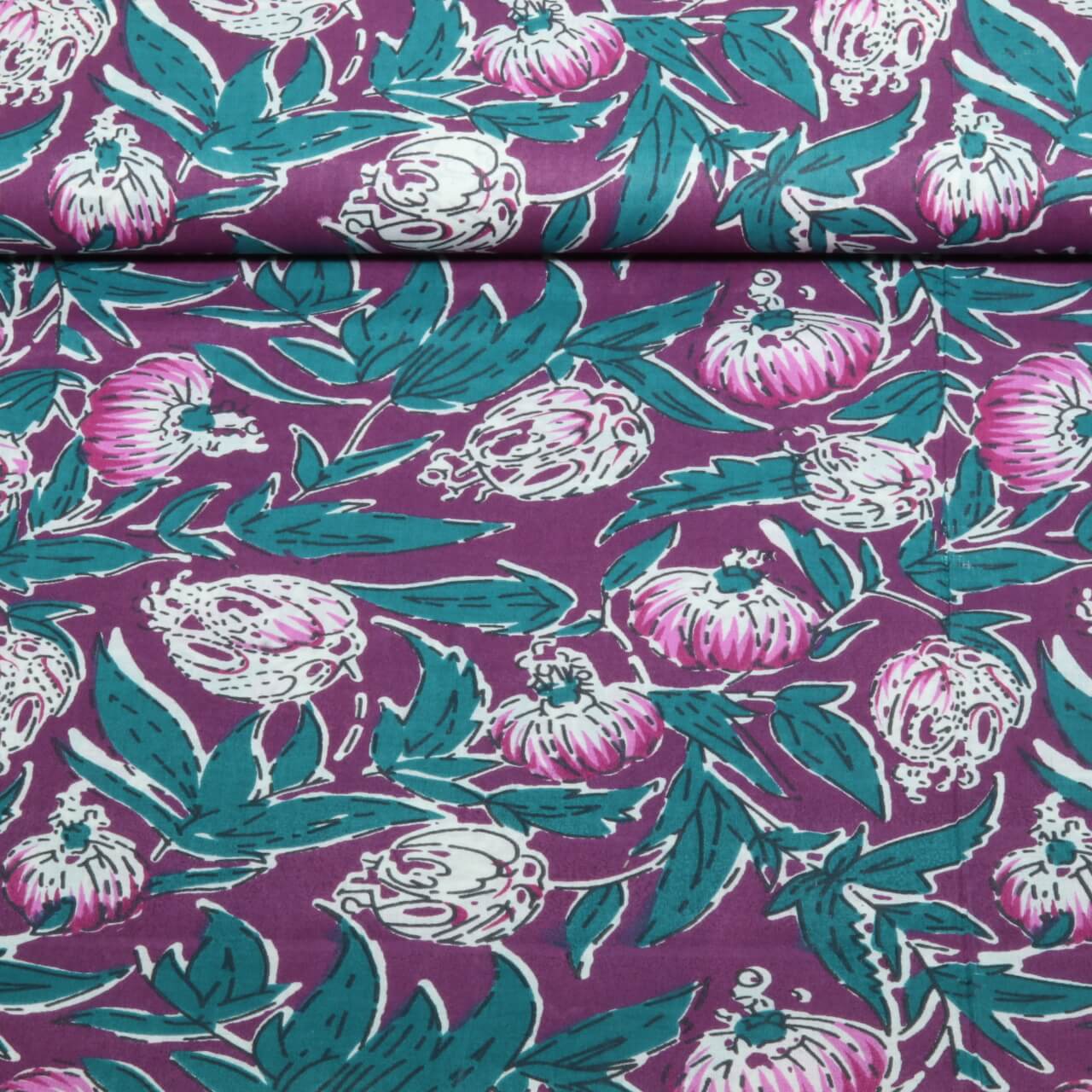 Baumwoll-Webware - Blockdruck Handgefertigt Blumen Lila