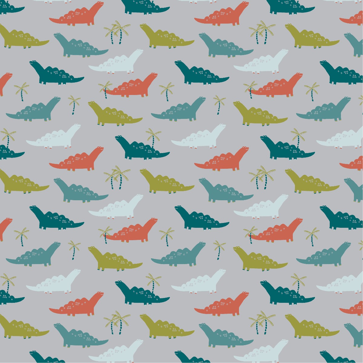 Baumwolle Bunte Dinos auf Hellgrau