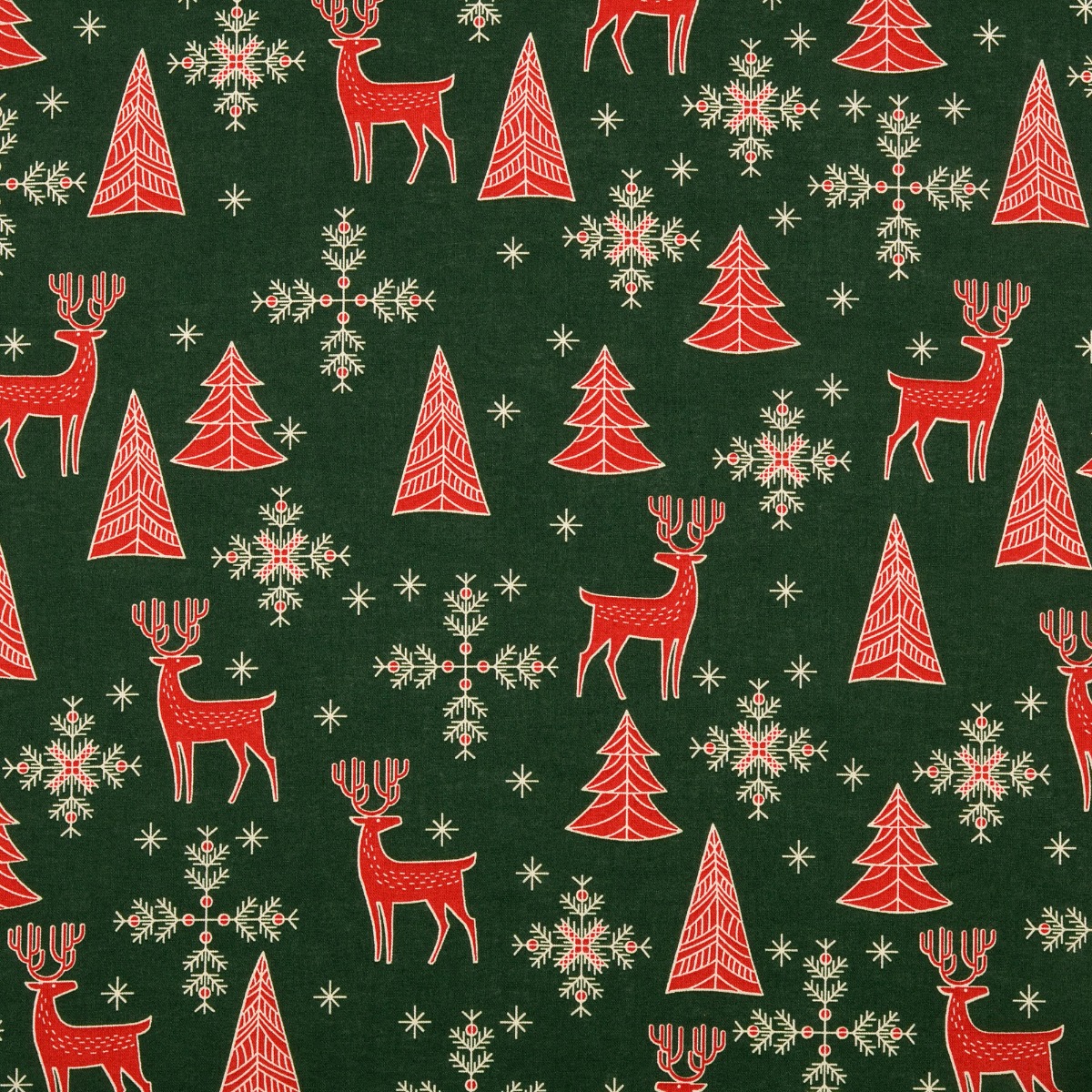 Baumwolle Christmas Rote Hirschen & Schneeflocken auf Dunkelgrün