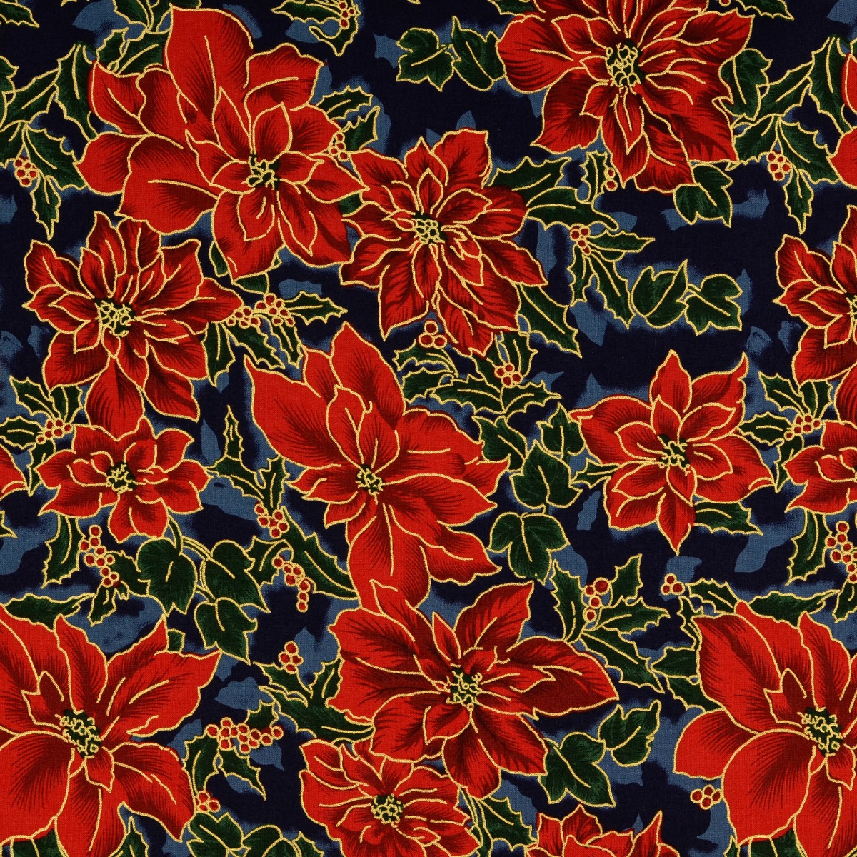 Baumwolle Golddruck Christmas Mistelzweige & Blüten auf Dunkelblau
