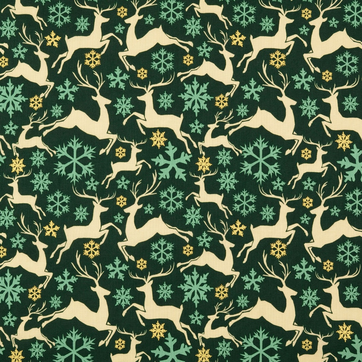 Baumwolle Golddruck Christmas Springende Hirschen & Schneeflocken auf Dunkelgrün