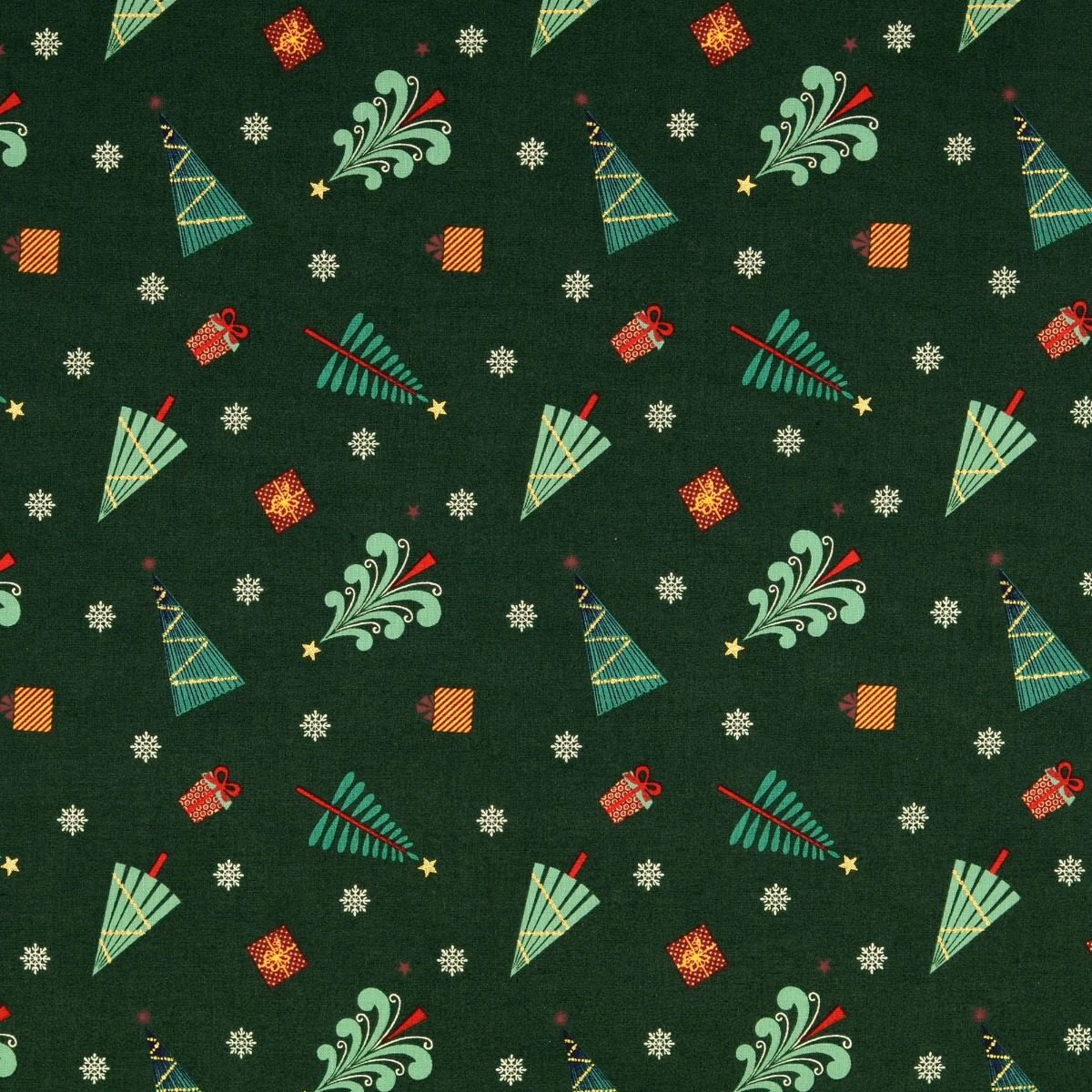 Baumwolle Golddruck Christmas Weihnachtsbäume & Geschenke auf Dunkelgrün