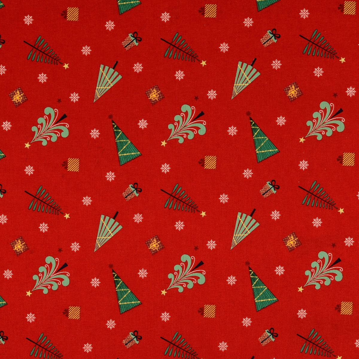 Baumwolle Golddruck Christmas Weihnachtsbäume & Geschenke auf Rot