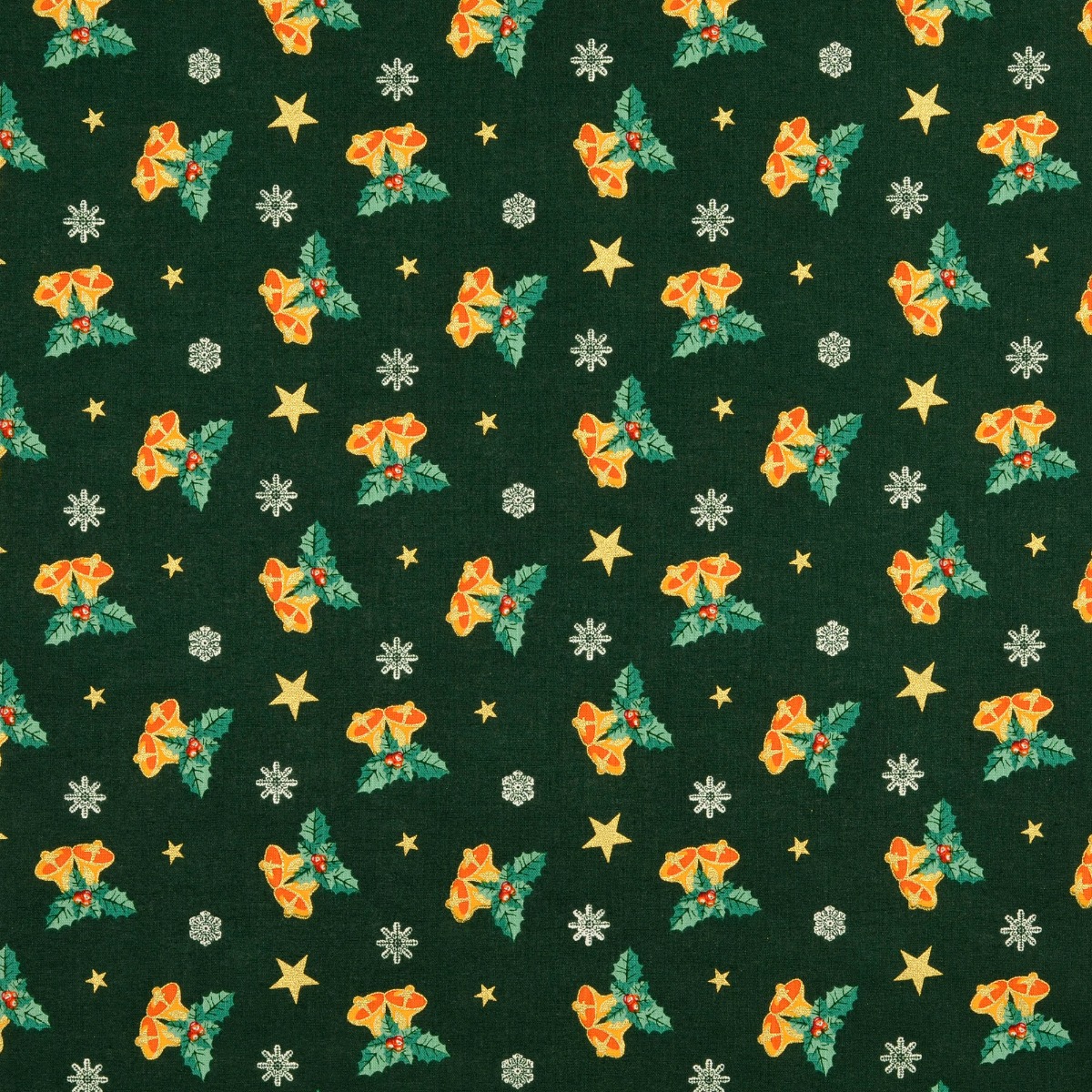 Baumwolle Golddruck Christmas Weihnachtsglocken auf Dunkelgrün