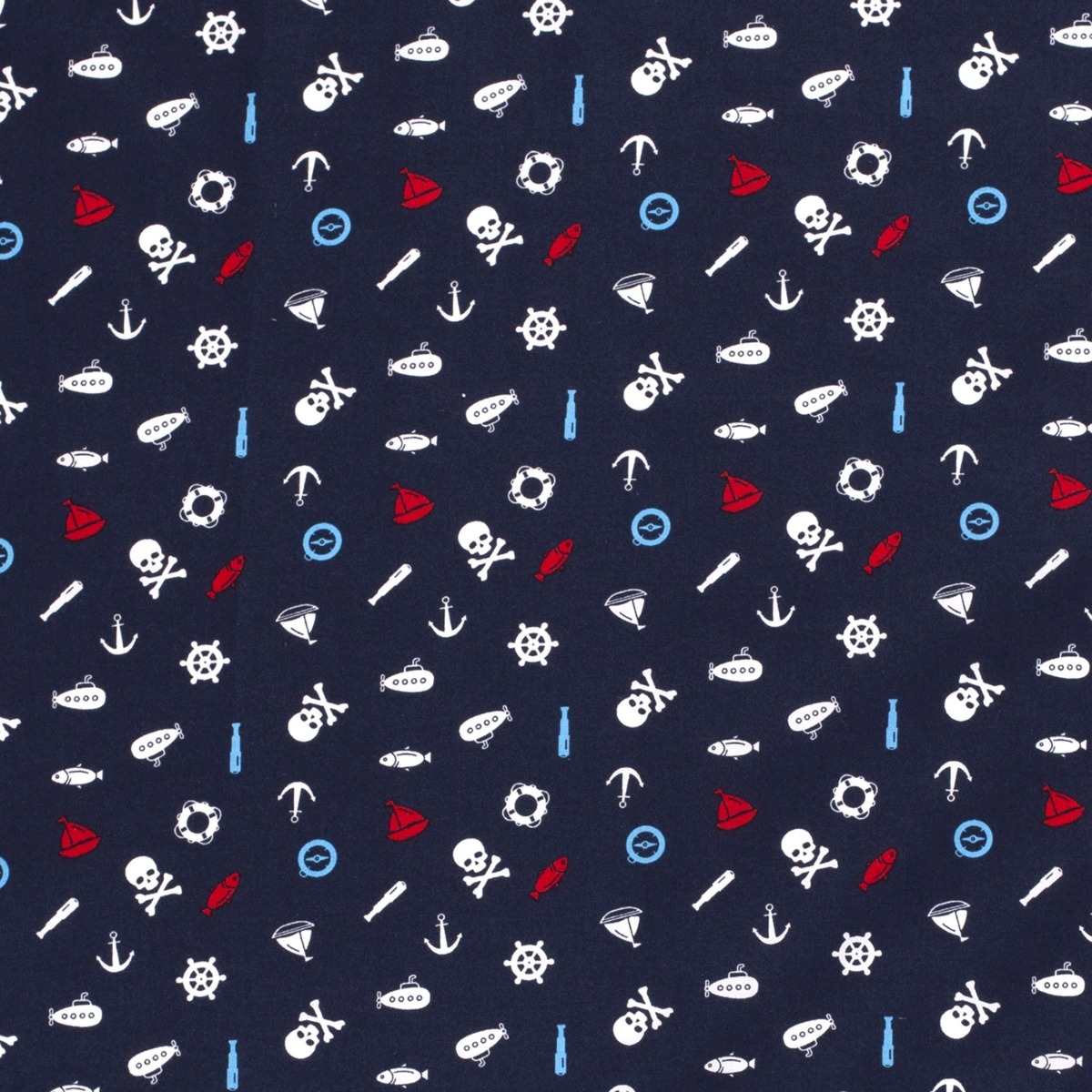 Baumwolle Kleine Maritime Symbole Hellblau, Weiß und Rot auf Dunkelblau