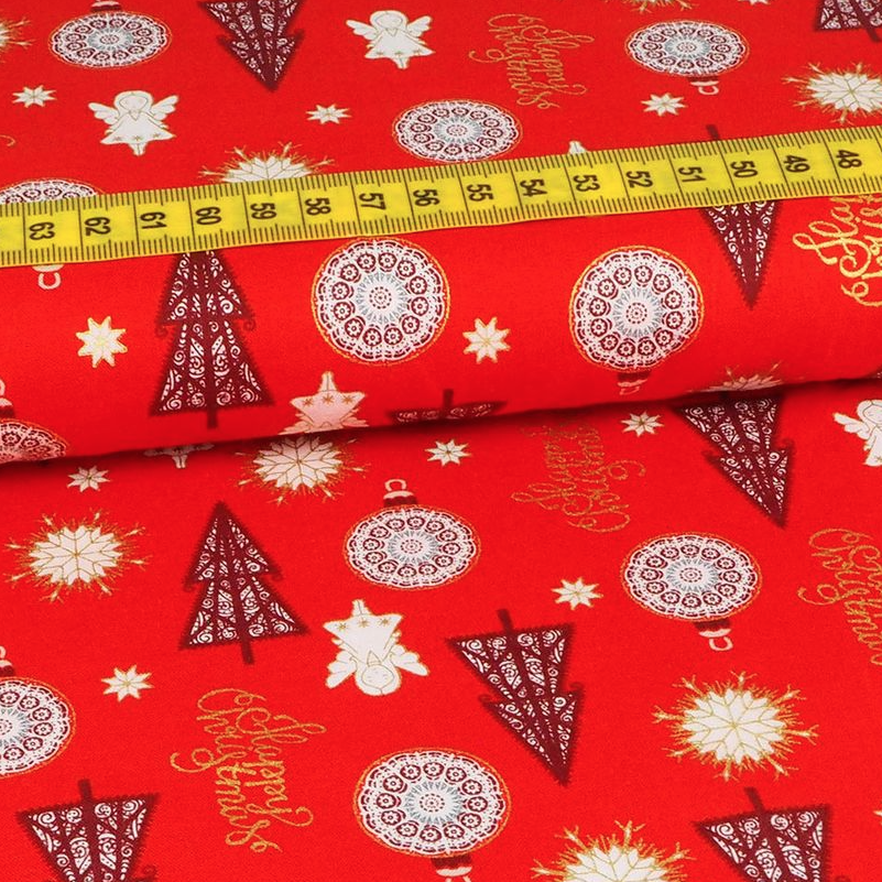 Baumwolle WEIHNACHTEN Christkind & Bäume auf Rot