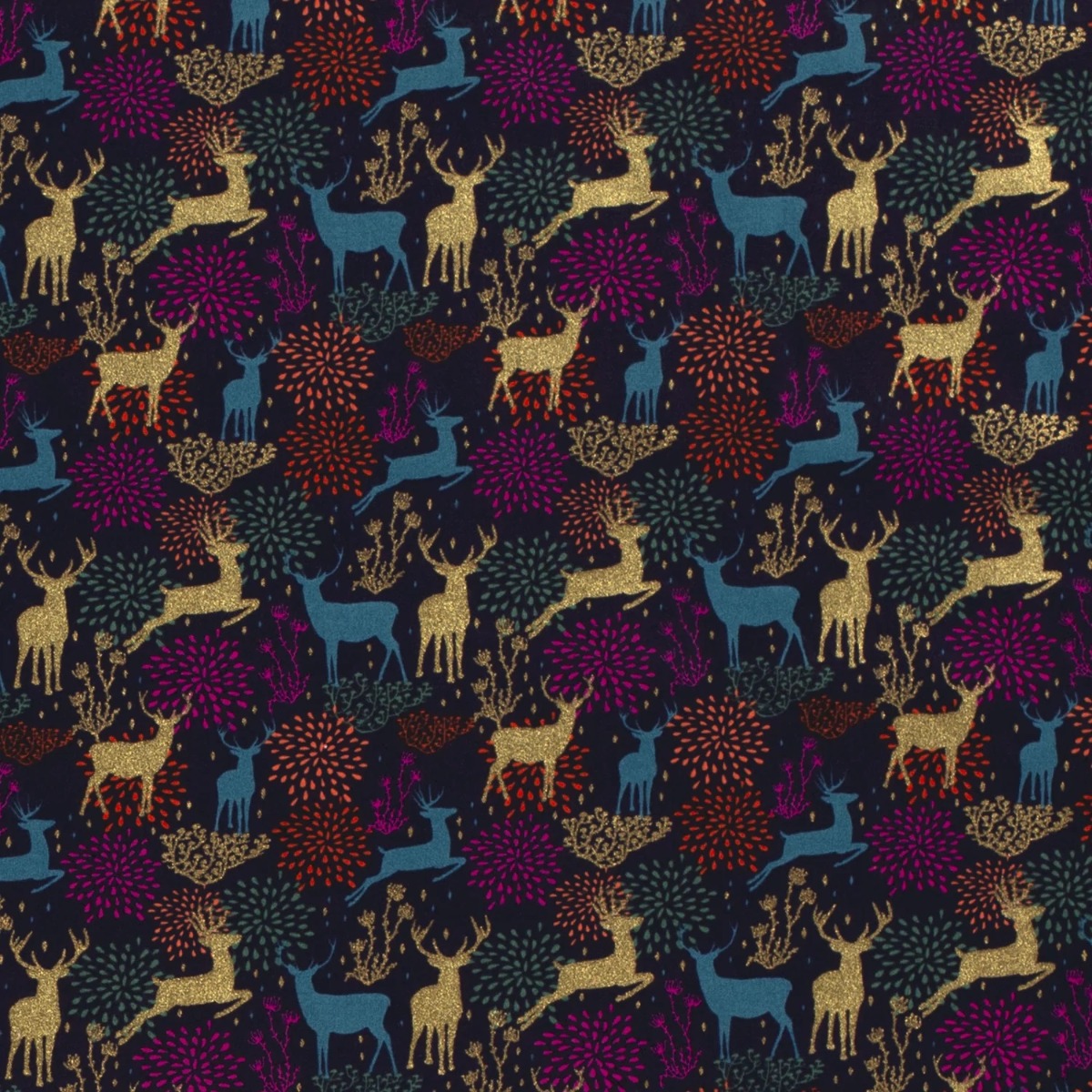 Baumwolle WEIHNACHTEN Foliendruck Hirsche und Gräser auf Dunkelblau