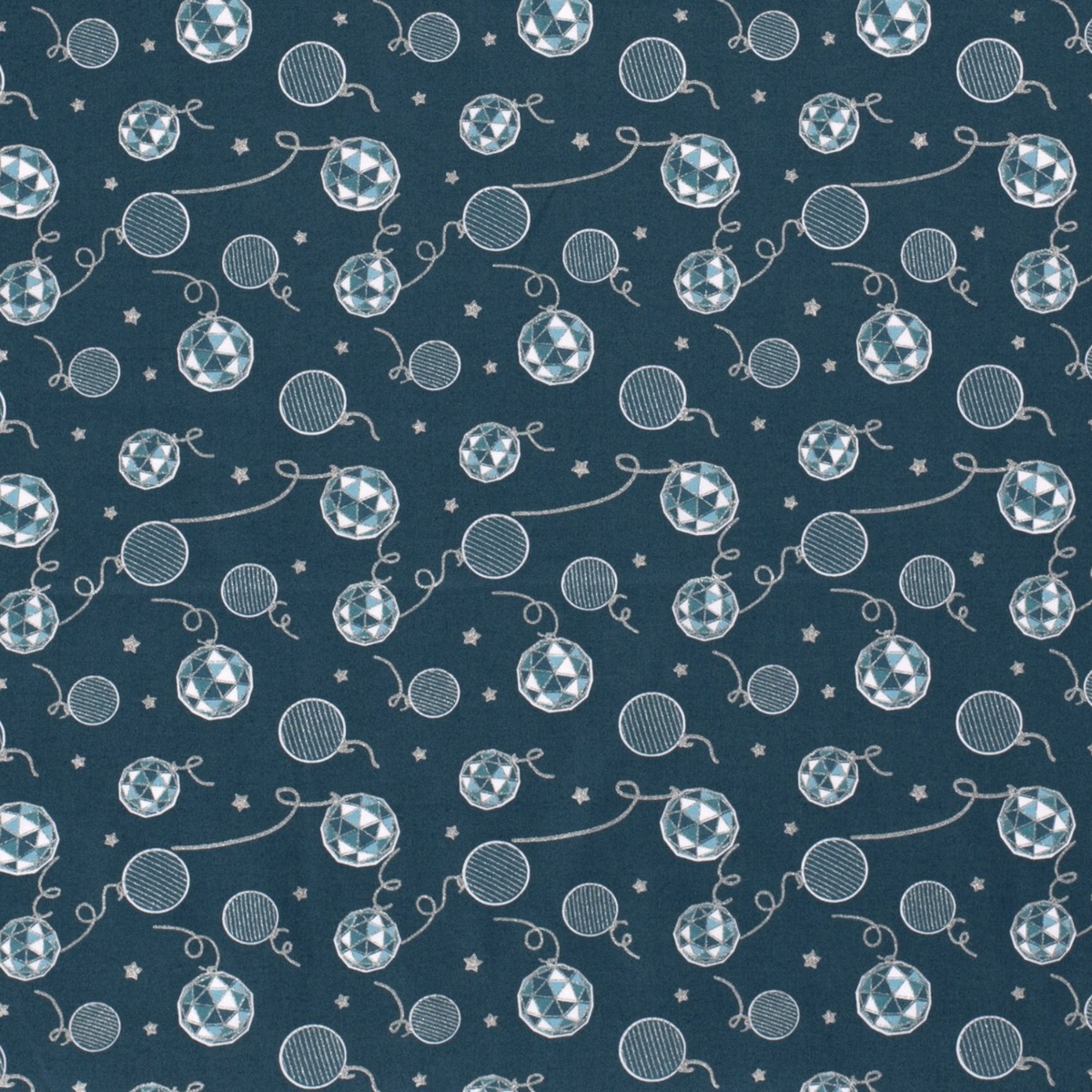 Baumwolle WEIHNACHTEN Foliendruck Silberne Christbaumkugeln auf Petrol