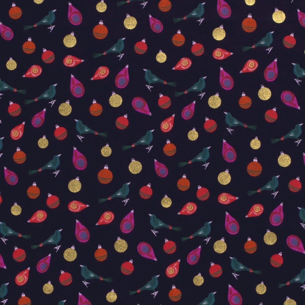 Baumwolle WEIHNACHTEN Foliendruck Vögelchen und Christbaumkugeln auf Dunkelblau