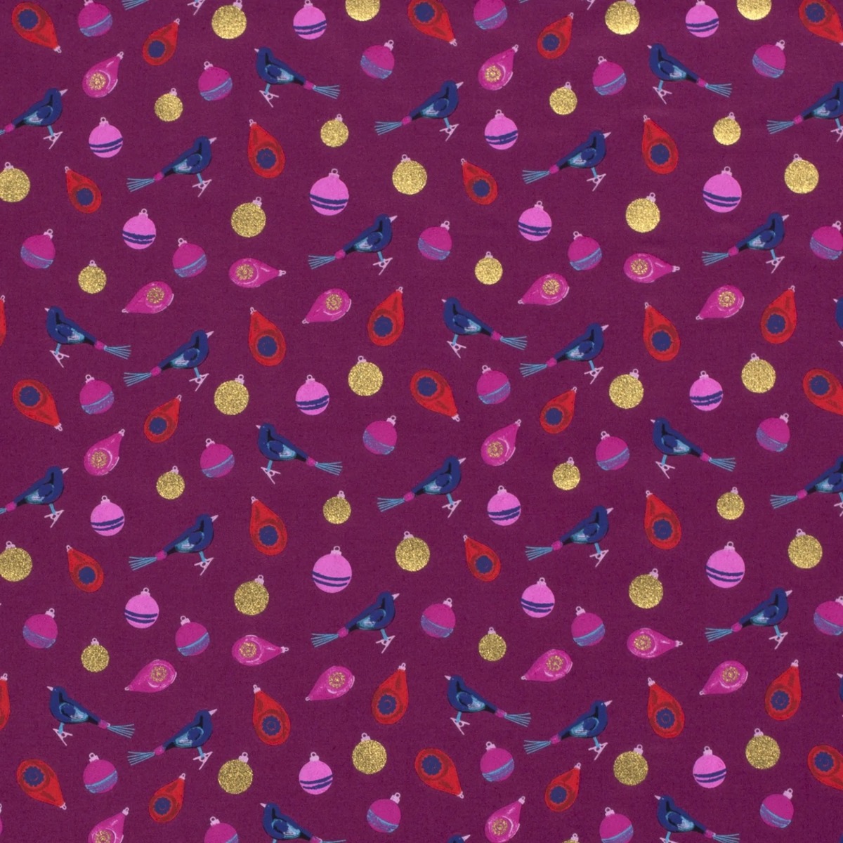 Baumwolle WEIHNACHTEN Foliendruck Vögelchen und Christbaumkugeln auf Fuchsia