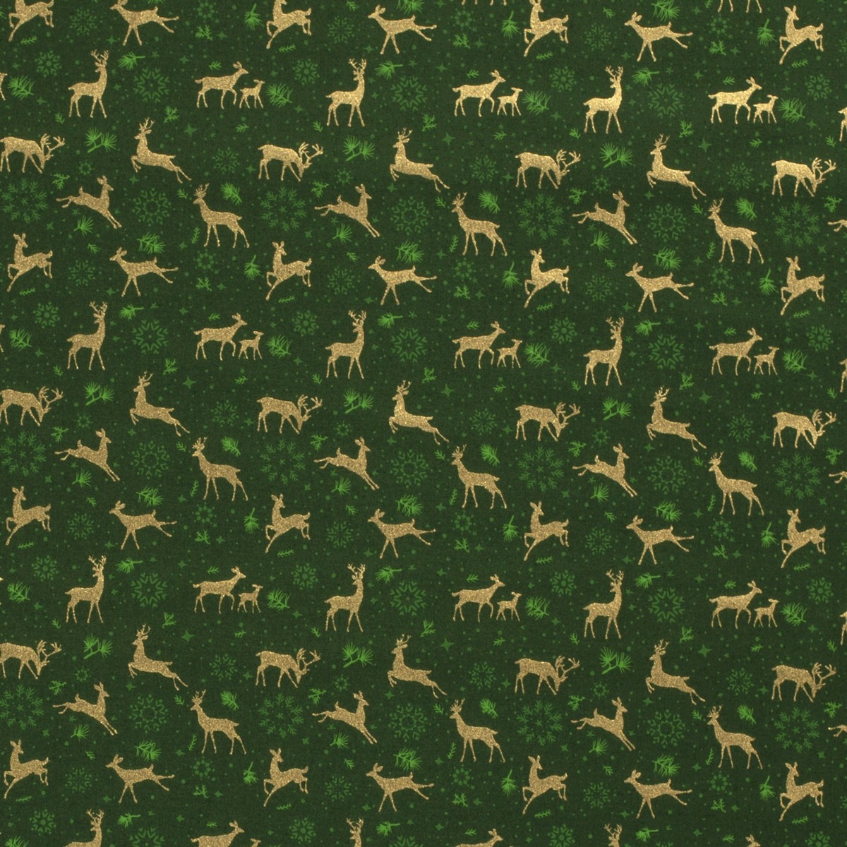 Baumwolle WEIHNACHTEN Golddruck Deer & Snowflakes auf Dunkelgrün