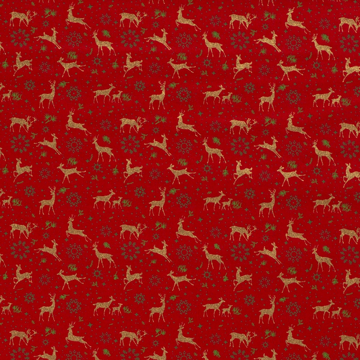 Baumwolle WEIHNACHTEN Golddruck Deer & Snowflakes auf Rot