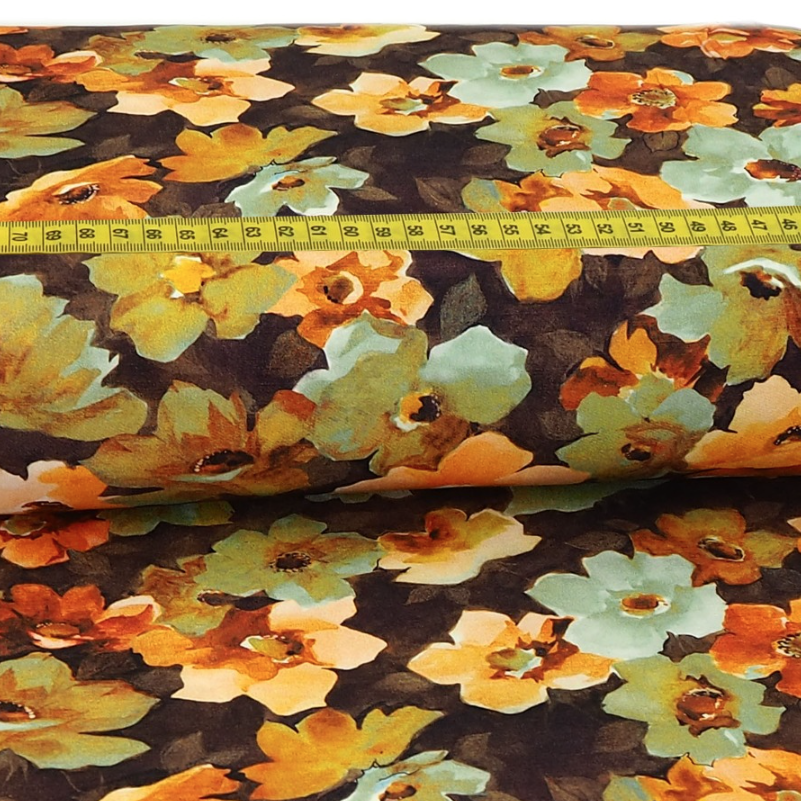 Bekleidungsstoff Viskose Bunte Aquarell Blumen auf Dunkelbraun Digital