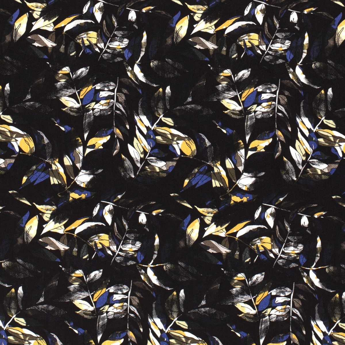 Bekleidungsstoff Viskose Bunte Blätter Blau/Gelb auf Schwarz