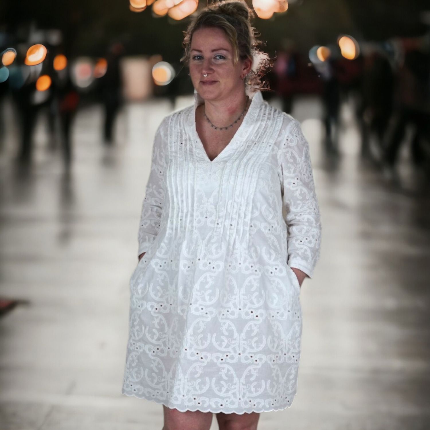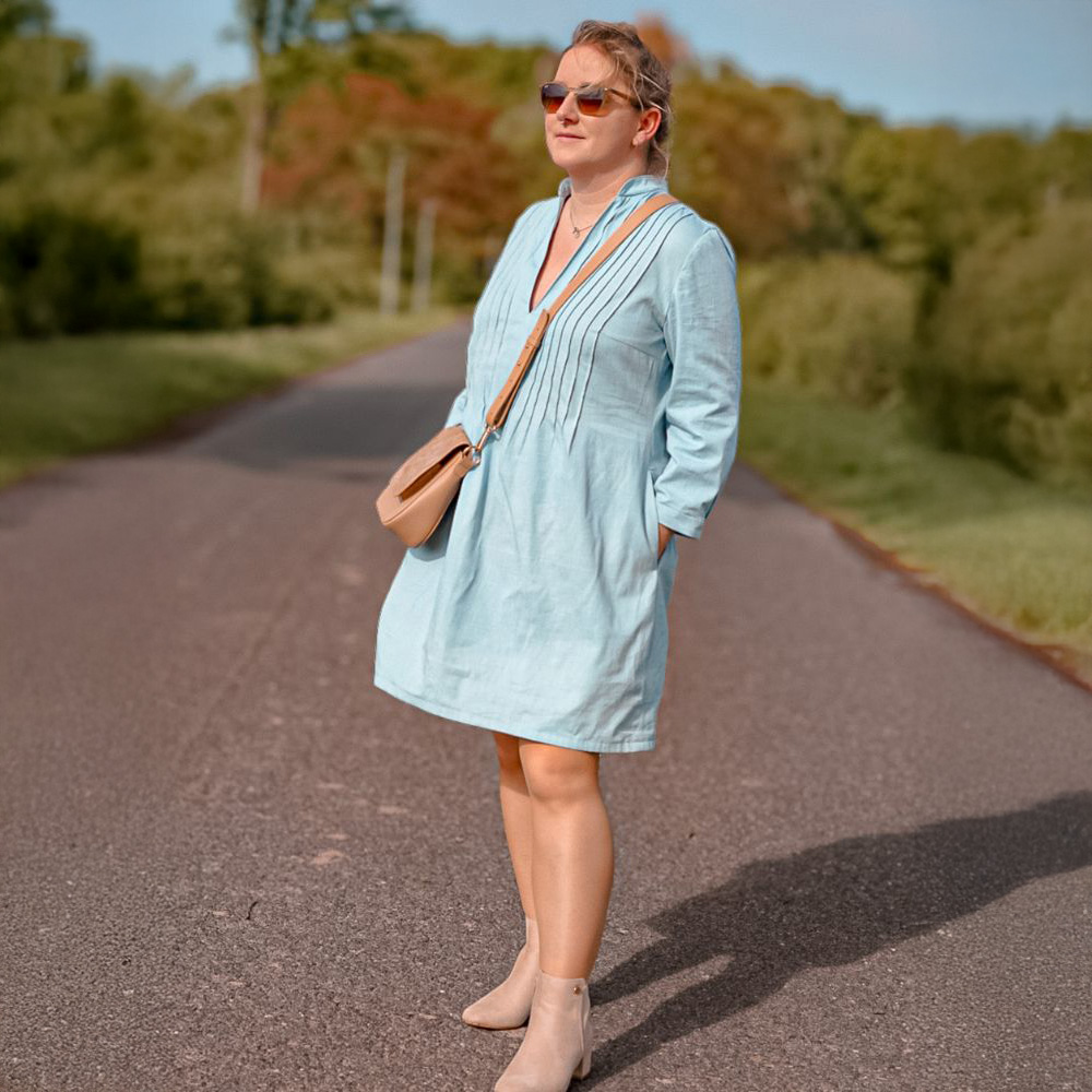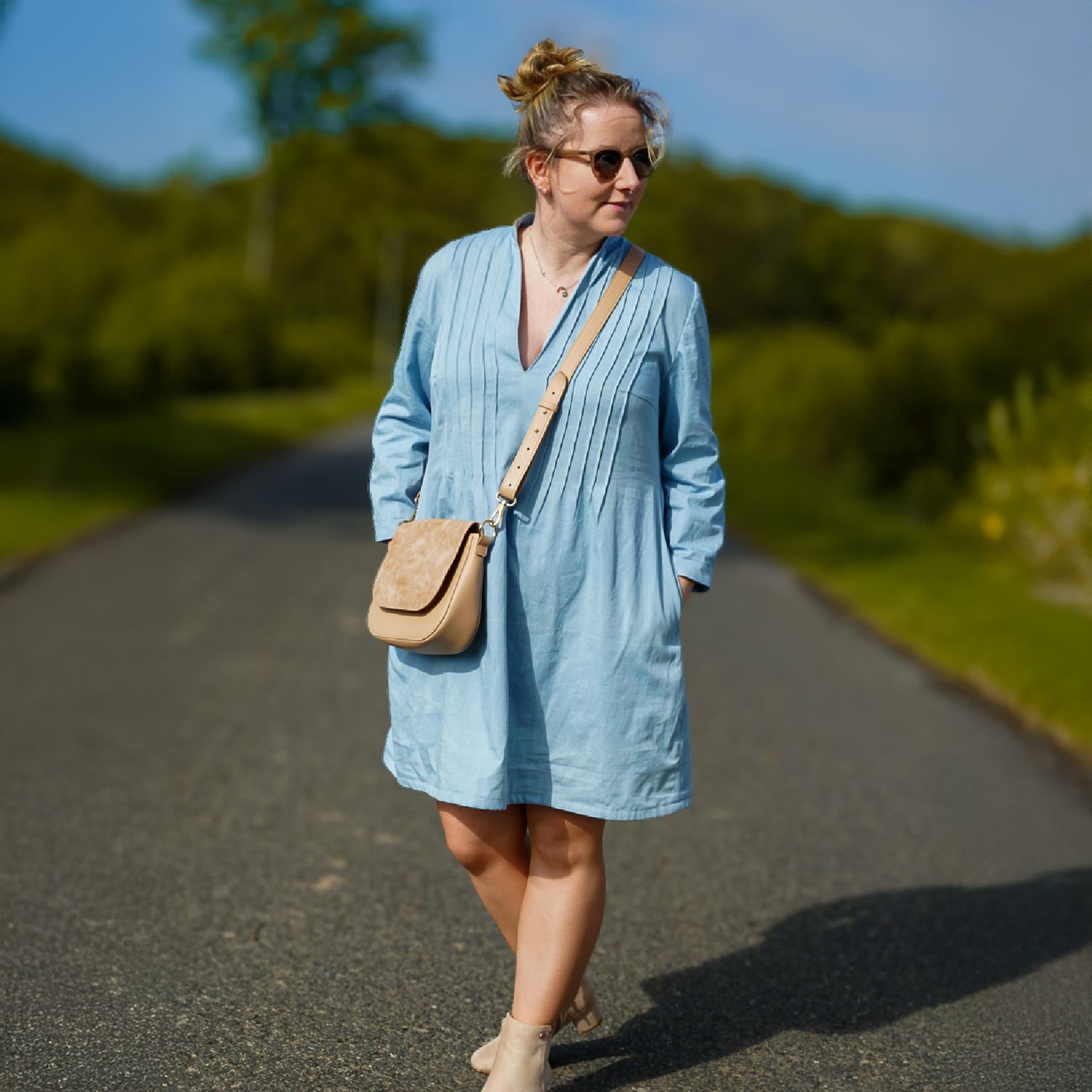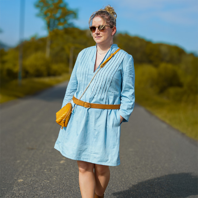 Åsunden ist ein ganz besonderes Sommerkleid mit formgebenden Biesen und Stehkragen. Im Vorderteil formen die Biesen das lockere Schlupfkleid. Abnäher im Brust- und Rückenbereich runden die Passform ab.