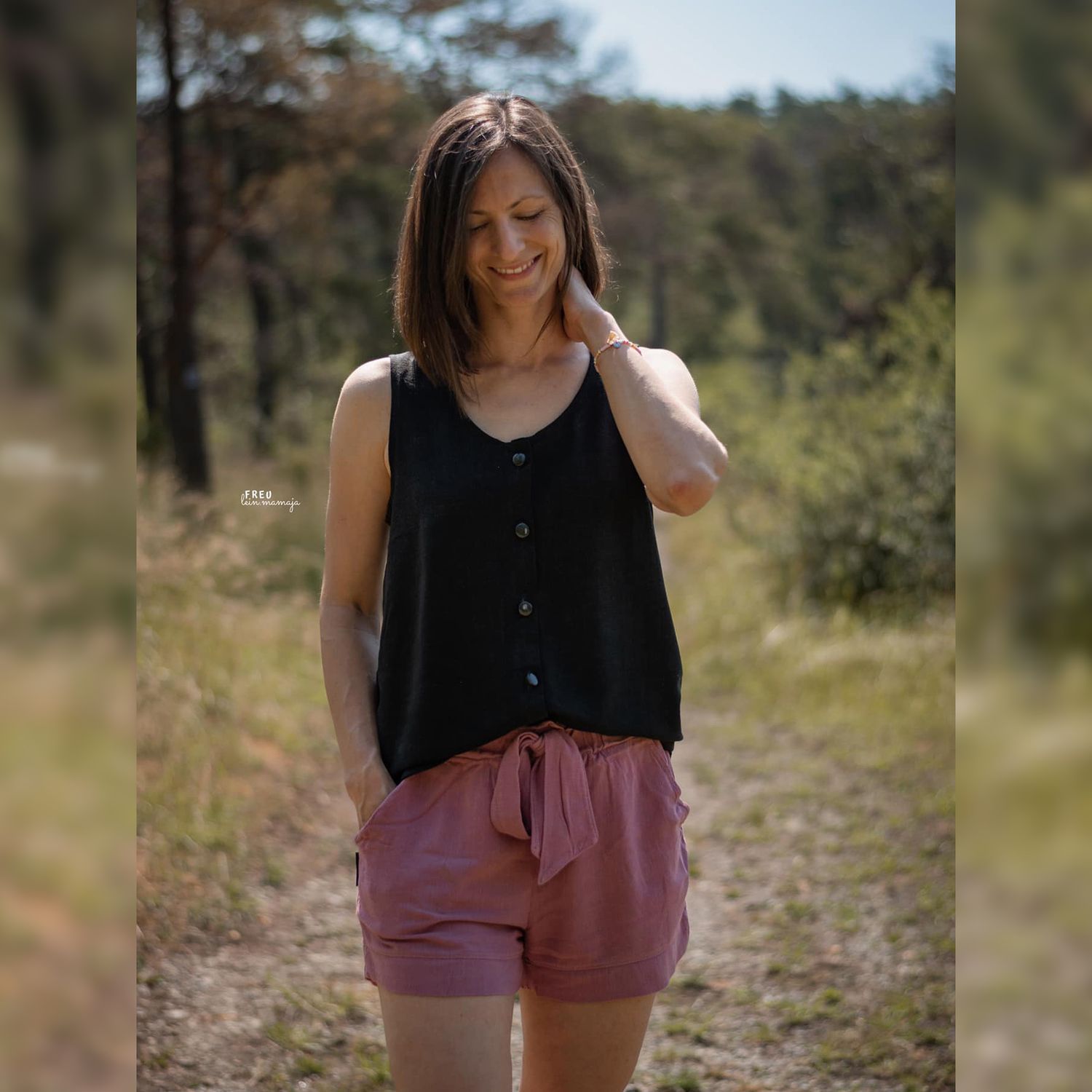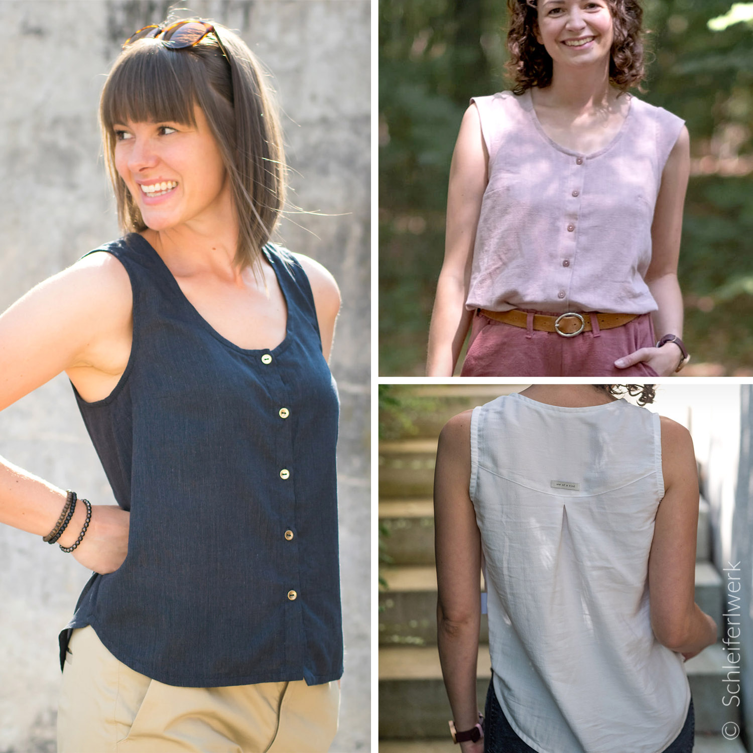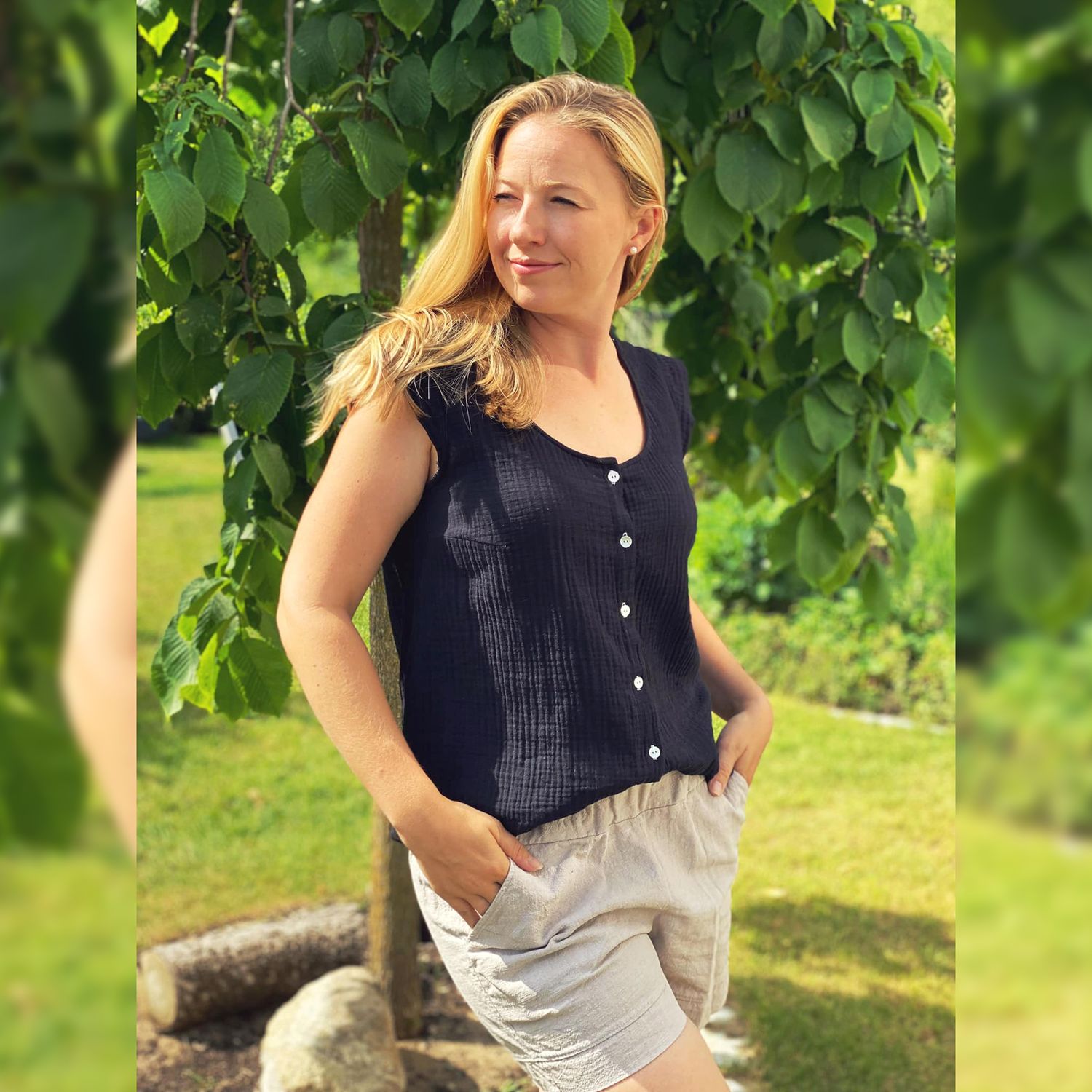 Die Breezy Blouse ist ein Schnittmuster für eine Bluse aus Webware. Du kannst sie mit Flügelärmeln, Kappärmeln oder ohne Ärmel nähen. Vorder- und Rückteil können gerafft oder mit Kellerfalte genäht werden und an der Knopfleiste kann eine Rüsche eingenäht werden.
