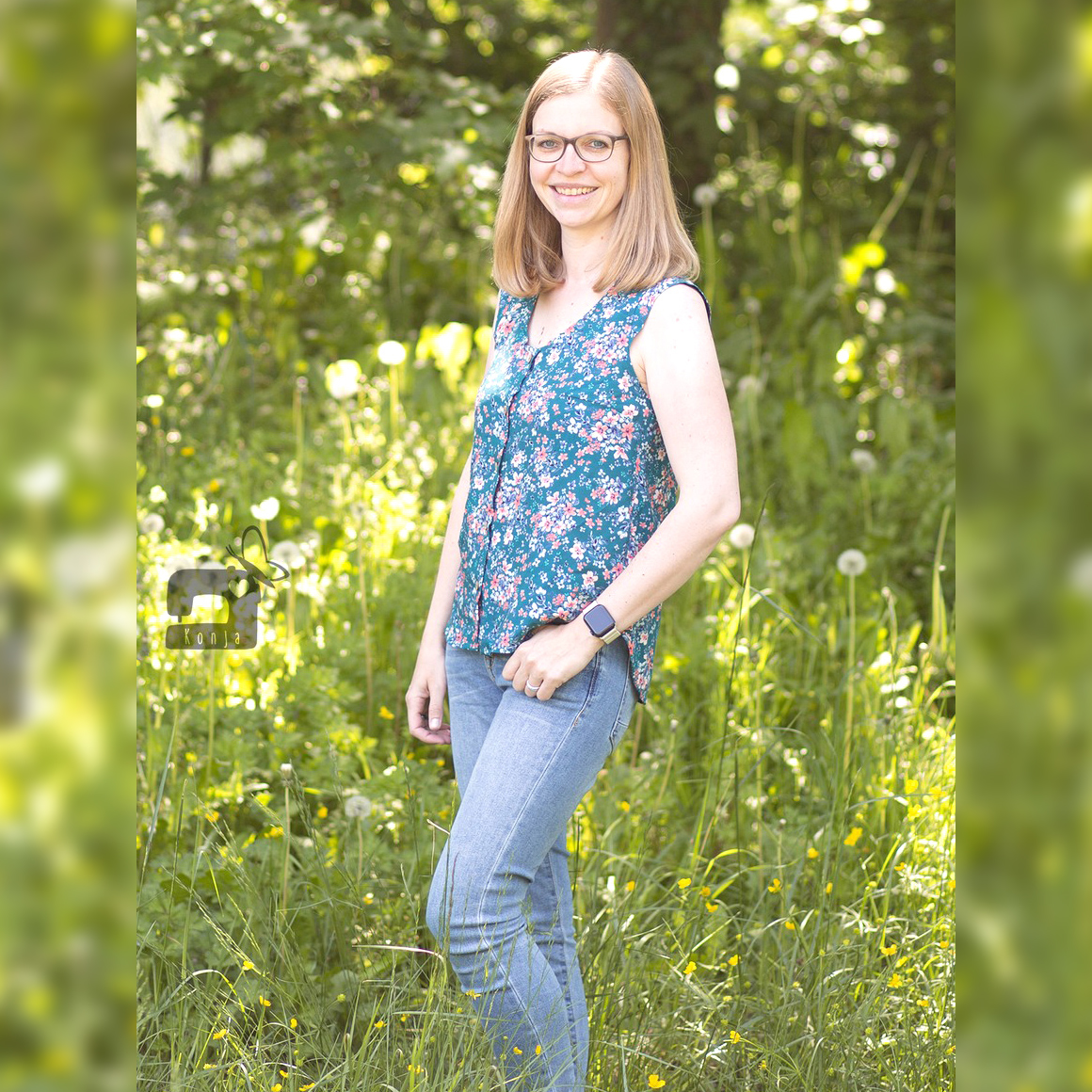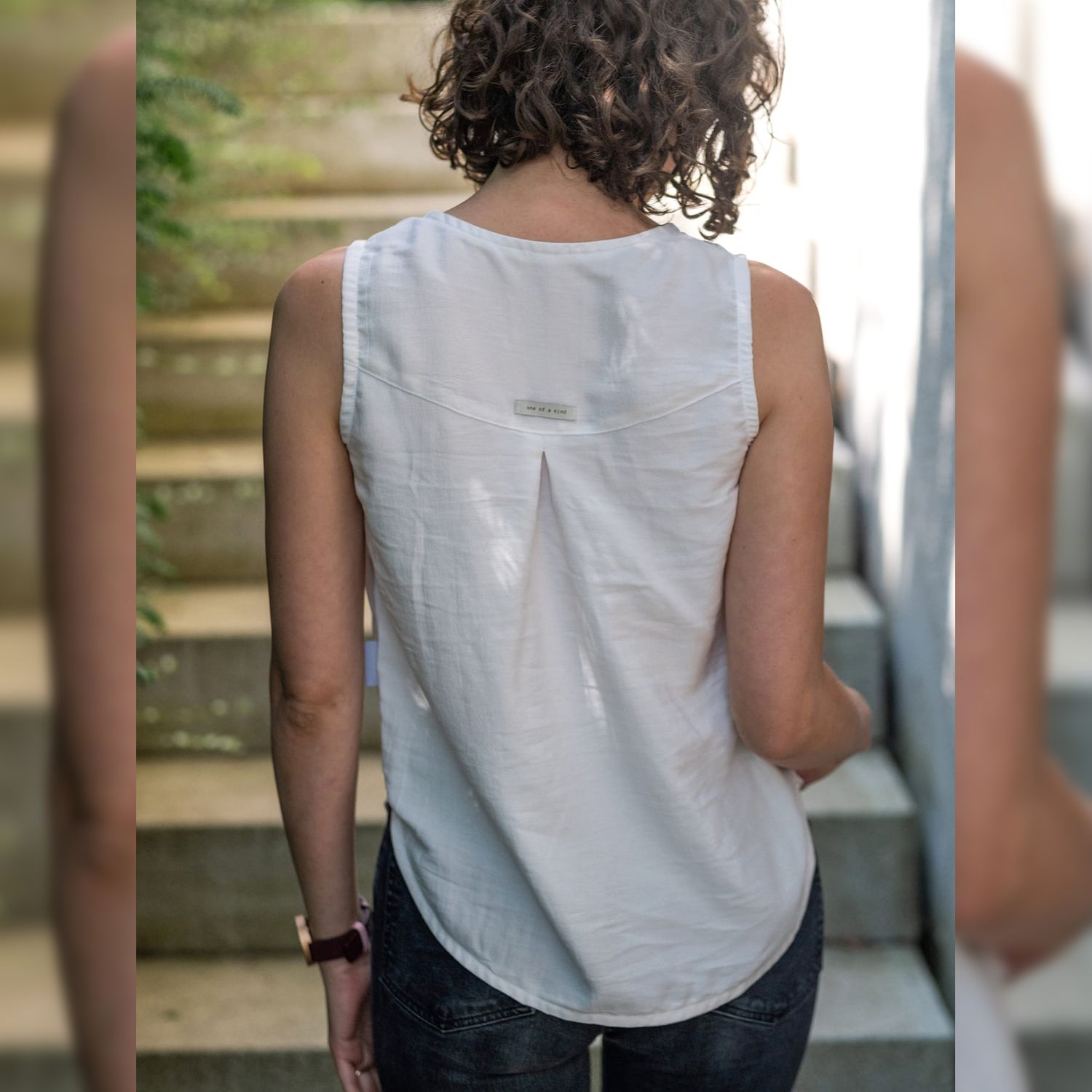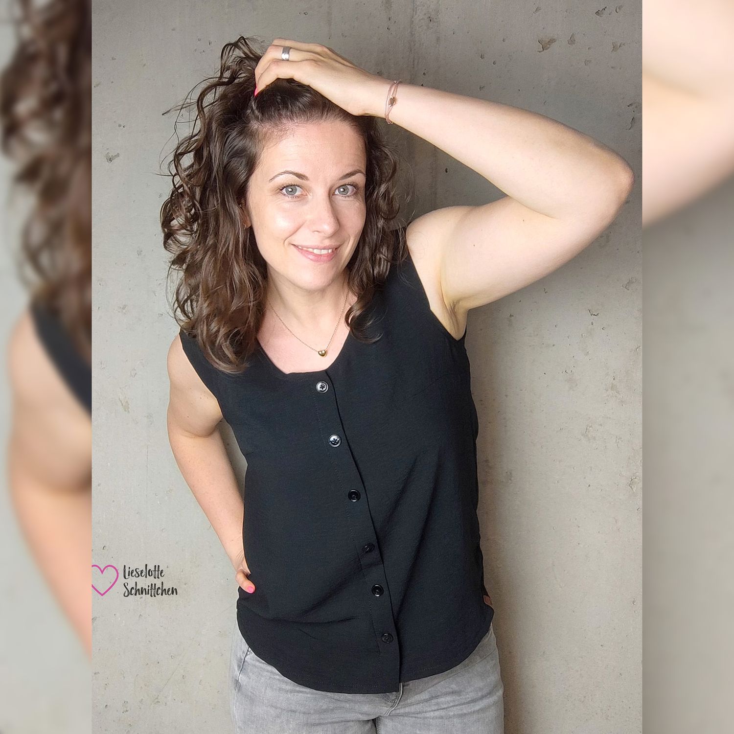 Die Breezy Blouse ist ein Schnittmuster für eine Bluse aus Webware. Du kannst sie mit Flügelärmeln, Kappärmeln oder ohne Ärmel nähen. Vorder- und Rückteil können gerafft oder mit Kellerfalte genäht werden und an der Knopfleiste kann eine Rüsche eingenäht werden.