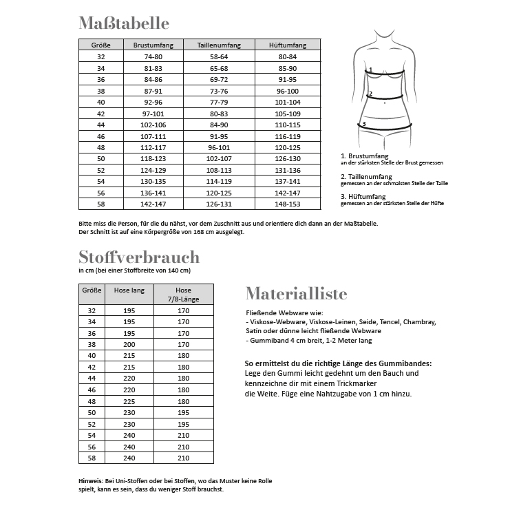 Egal ob für Frühling, Sommer oder entspannte Tage zu Hause – die Culotte mit Gummibund sitzt perfekt, sieht stylisch aus und lässt sich vielseitig kombinieren.Die weite, fließende Passform sorgt für ein angenehmes Tragegefühl und einen zeitlosen Look. Kombiniert mit leichten Stoffen wie Viskose, Leinen oder Crepe entsteht im Handumdrehen eine Hose, die sowohl elegant als auch alltagstauglich ist. Durch den elastischen Bund ist sie schnell genäht – ideal auch für Nähanfängerinnen.