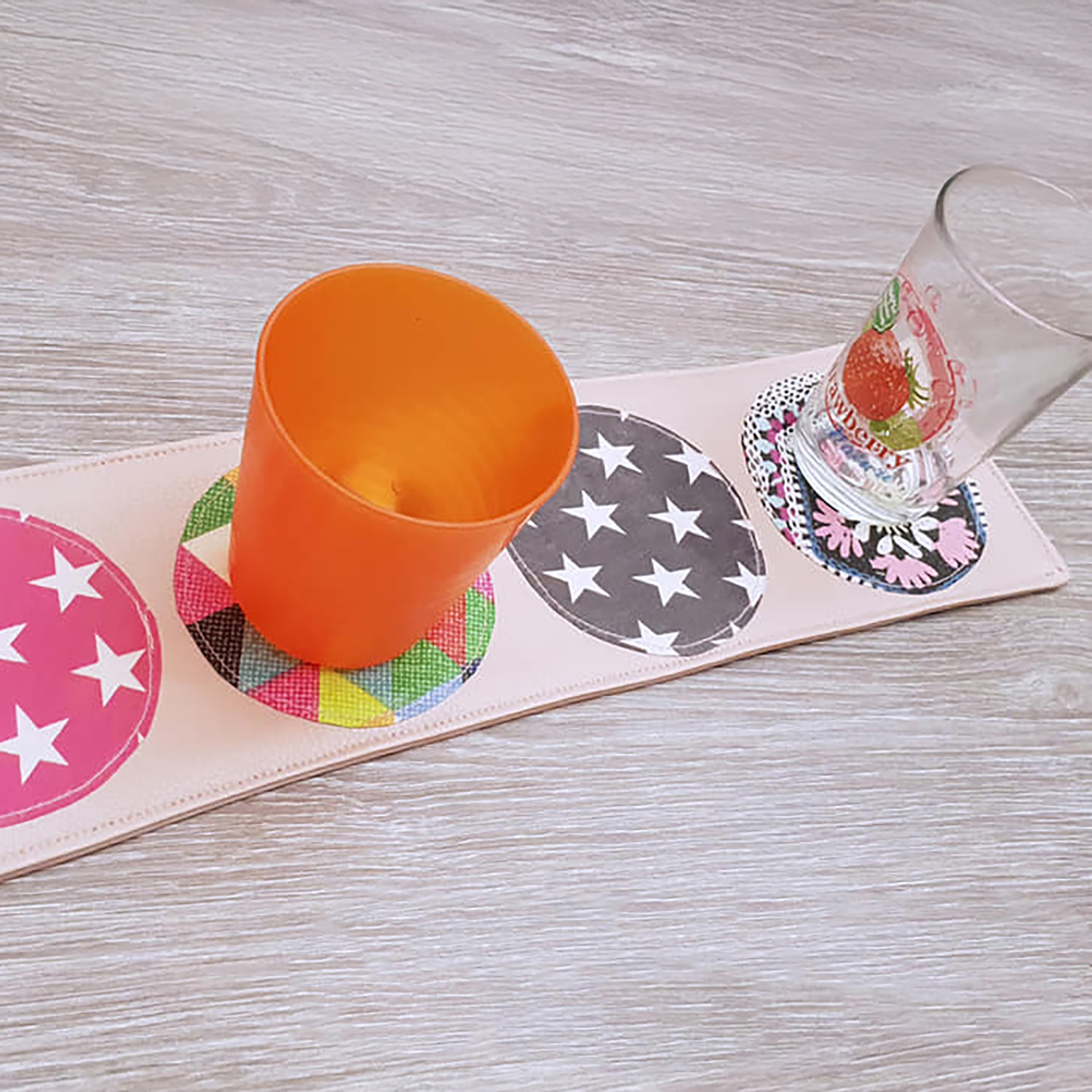 Nähanleitung und Schnittmuster gestaltet als PDF-E-Book für einen Glasuntersetzer in 2 Größen und Varianten. Nie mehr Wasserränder und endlich Ordnung mit dem schnell genähten Glasuntersetzer.