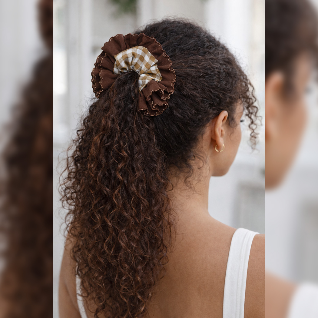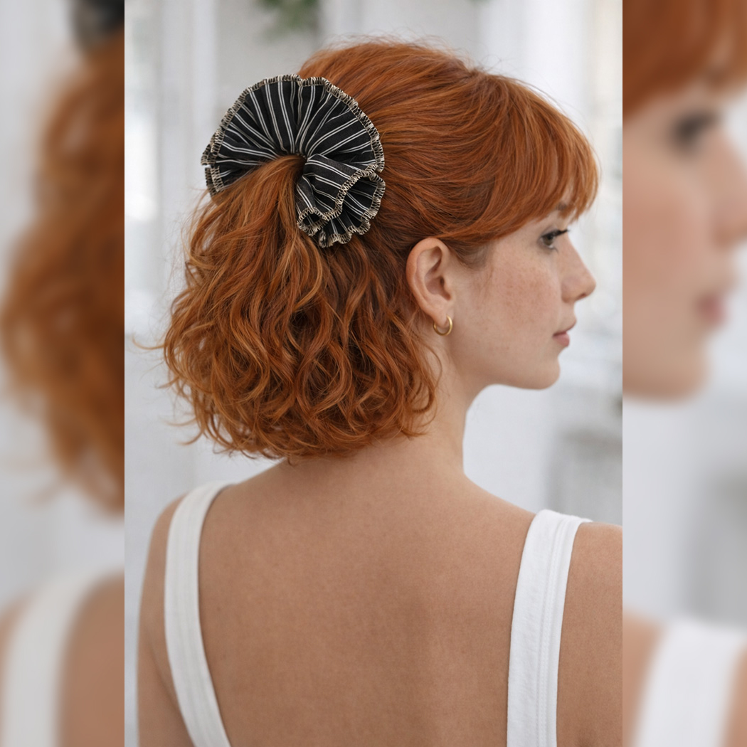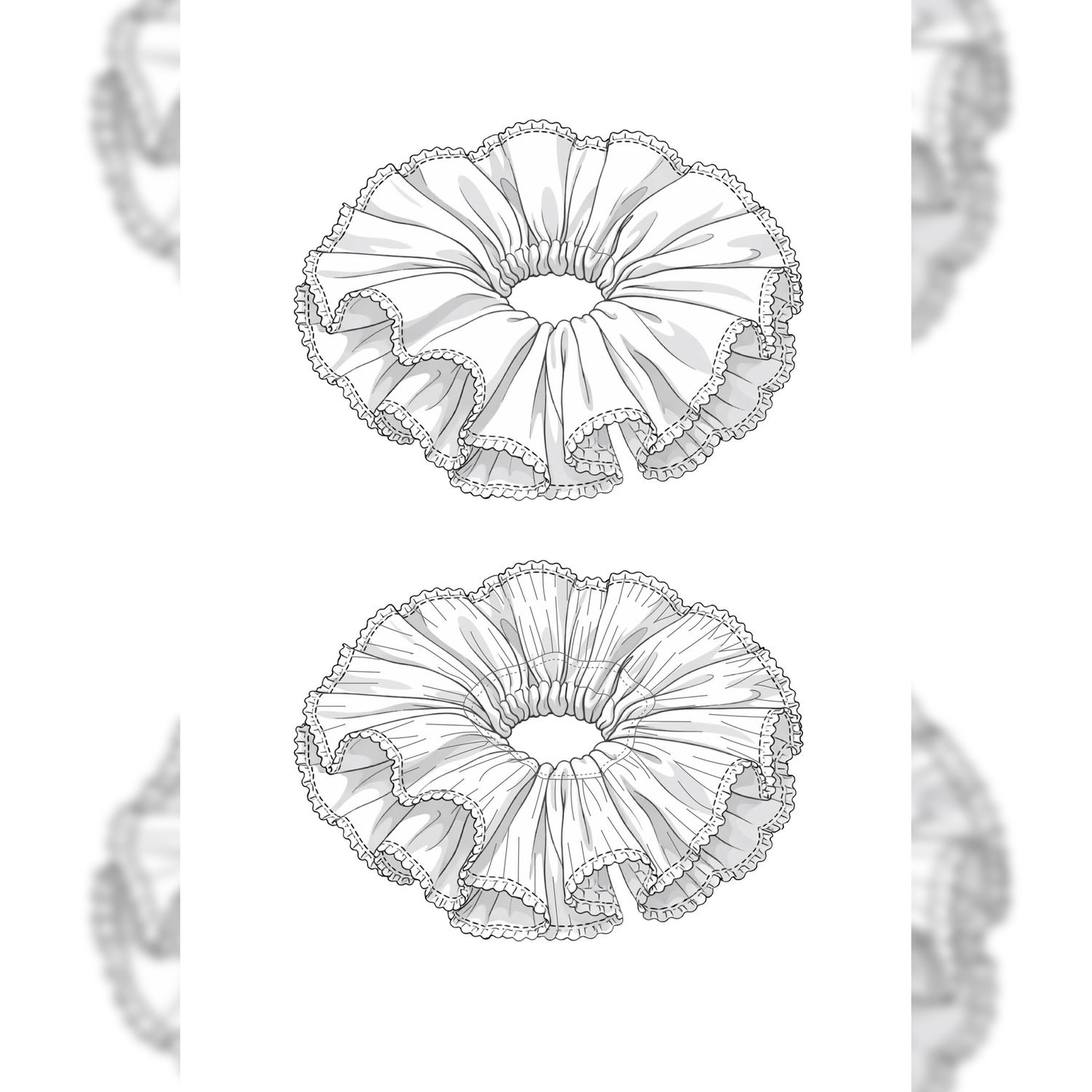 Kreiere ein echtes Statement-Accessoire mit diesem Ruffle Scrunchie Schnittmuster – einem modernen, voluminösen Scrunchie Schnittmuster mit geraffter Mitte und breiter, angesetzter Plissee-Rüsche mit versäubertem Außenrand (optional).