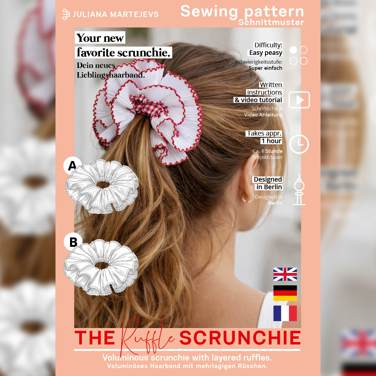 Voluminöses und trendiges Scrunchie Schnittmuster mit optionaler Rüschenborte zum Nähen. Mit Video Nähtutorial auf YouTube und www.julianamartejevs.com/tutorials