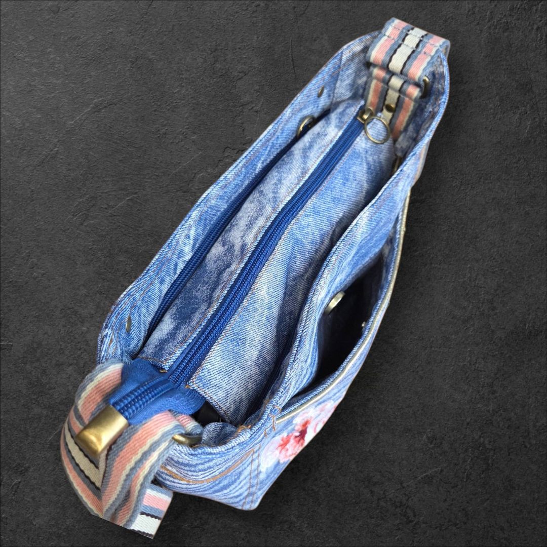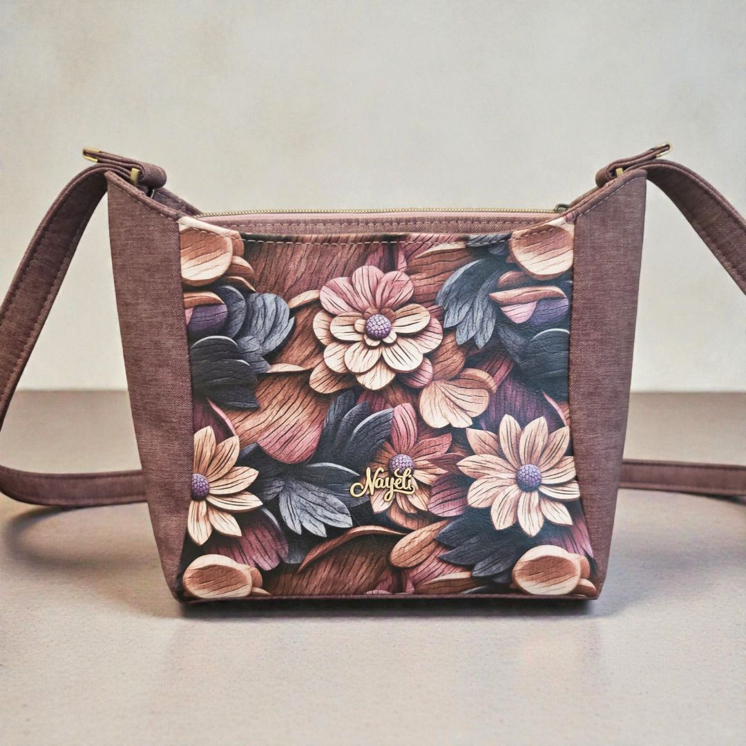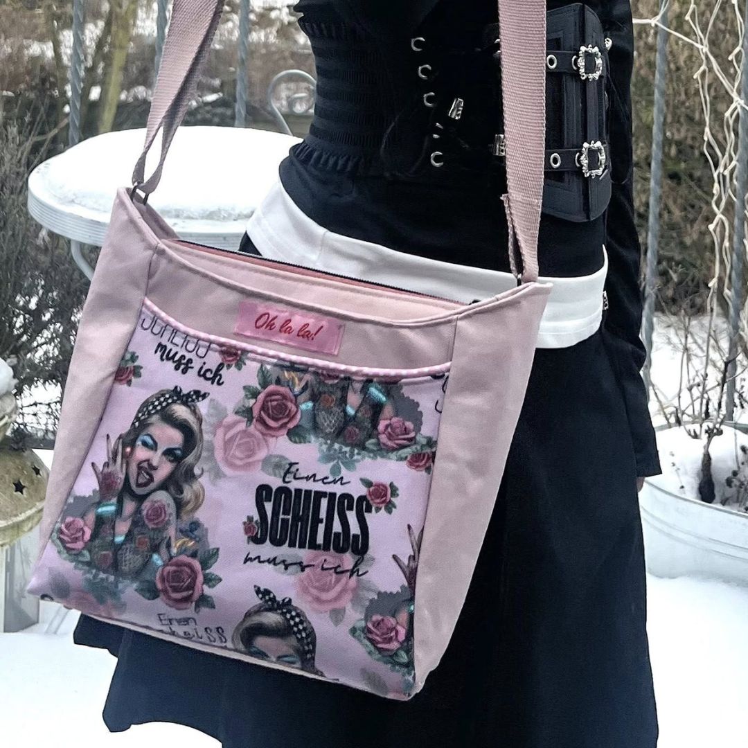 Getragen wird die Tasche an einem Schultergurt, dessen Aufhängung in den hochgezogenen Seiten verborgen ist.