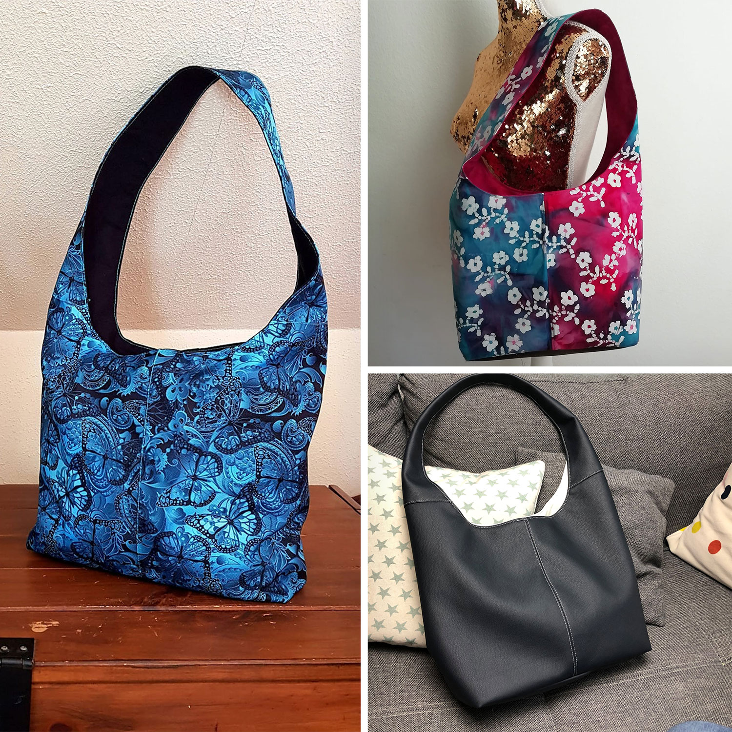 Die HoboBag Kate ist eine schlichte Hobobag, welche wahlweise mit einem oder auch zwei unterschiedlichen Außenstoffen genäht werden kann. Dank eines kurzen Stoffträgers kommt sie ohne zusätzliches Taschenzubehör aus. Wahlweise lässt sich die Hobobag mit einem Reißverschluss oder einem Magnetknopf schließen. Auf der Innenseite wartet in beiden Fällen eine Reißverschluss-Innentasche.