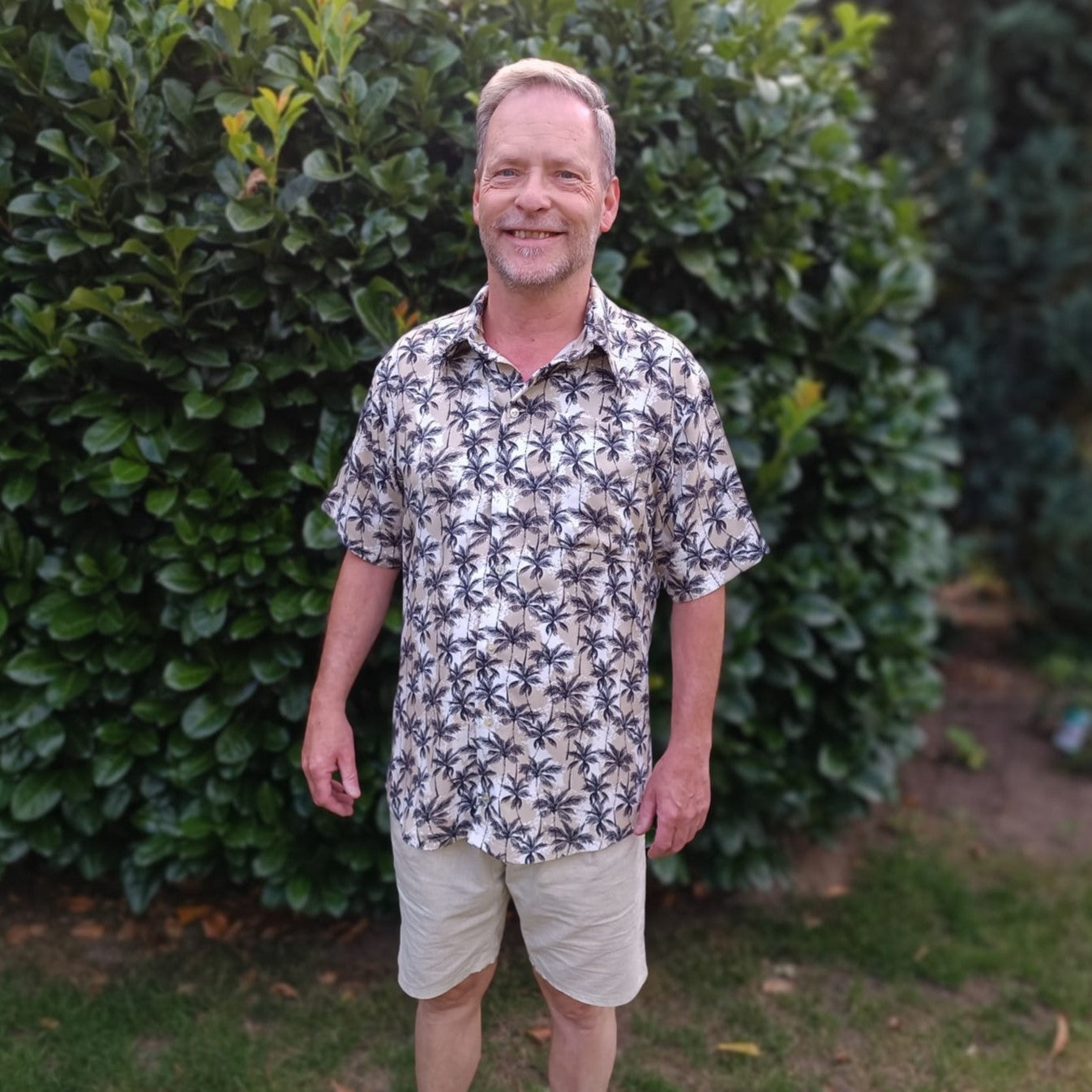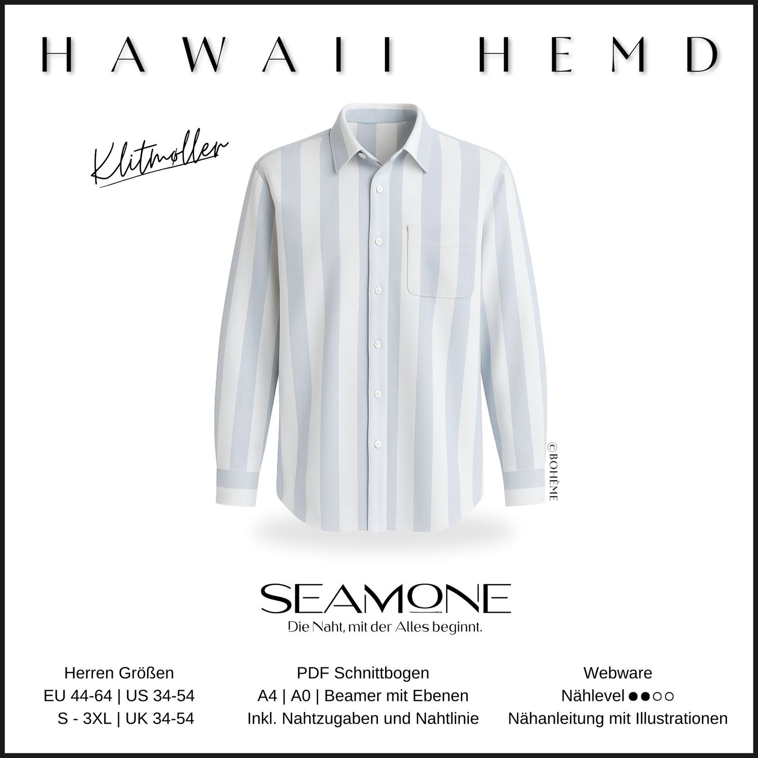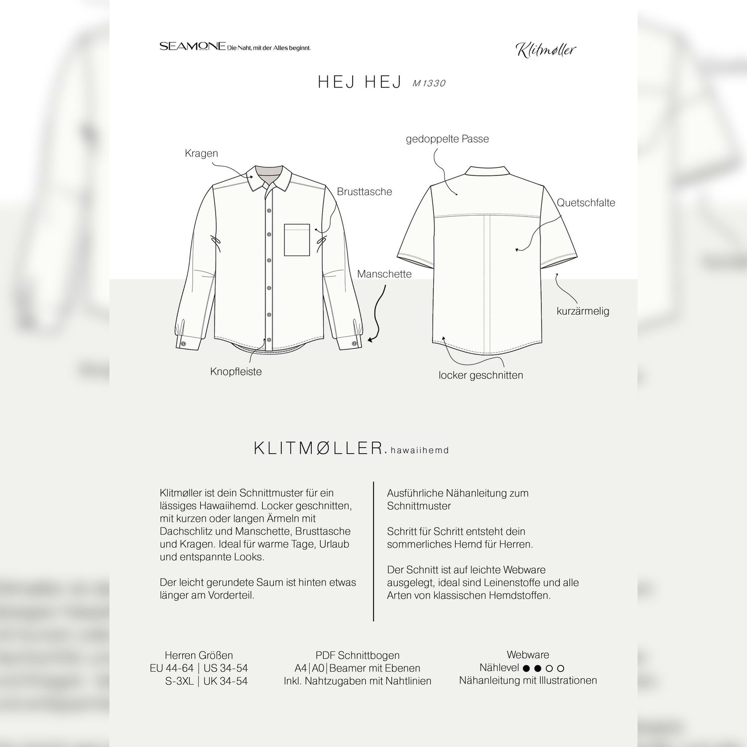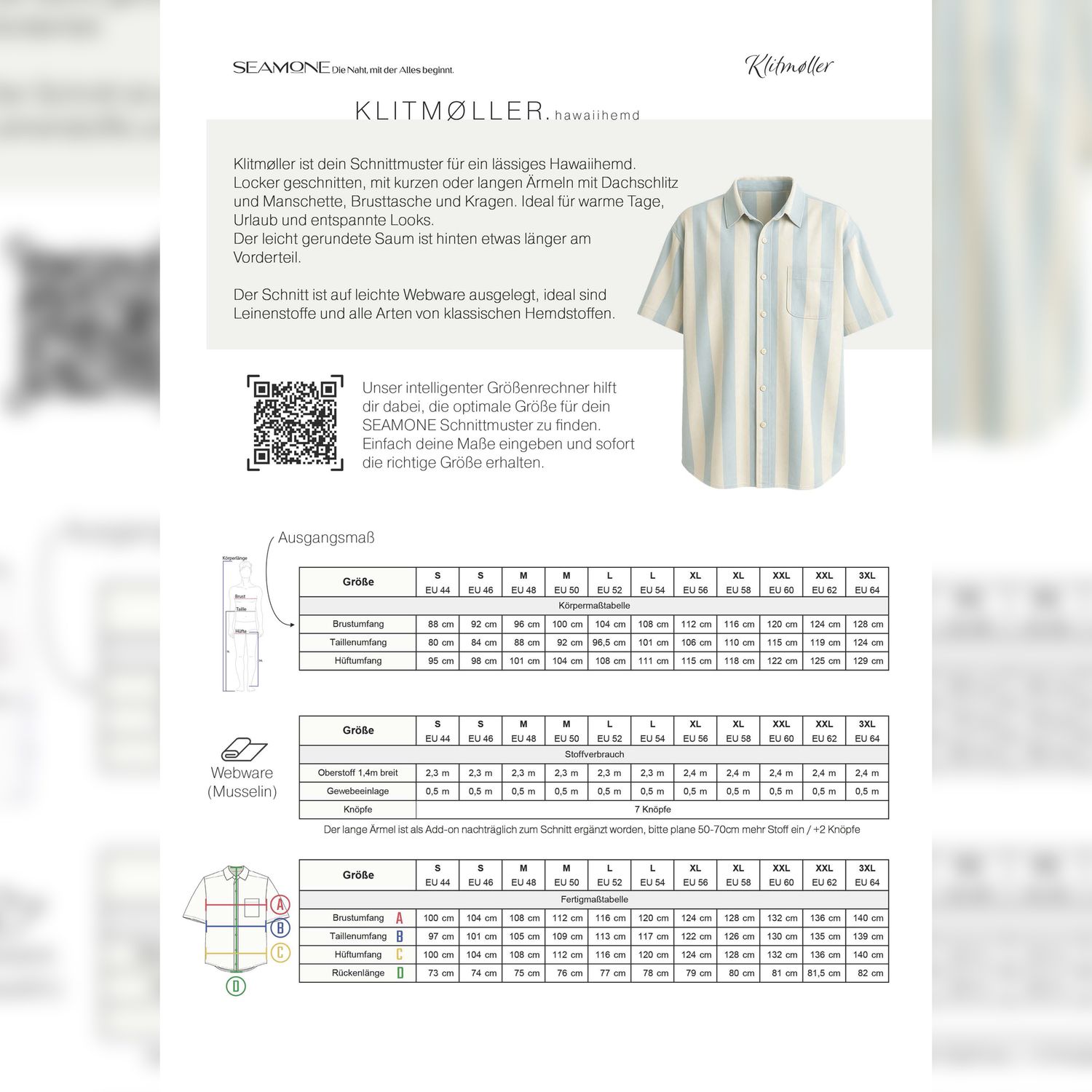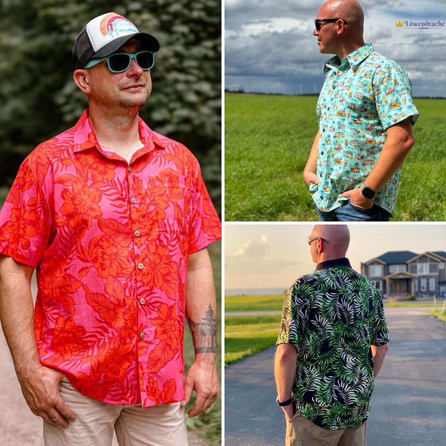 Klitmøller ist ein digitales Schnittmuster für ein lässiges Hawaiihemd in Herrengröße – locker geschnitten, mit kurzen Ärmeln, Brusttasche und Kragen. Ideal für warme Tage, Urlaub und entspannte Looks.