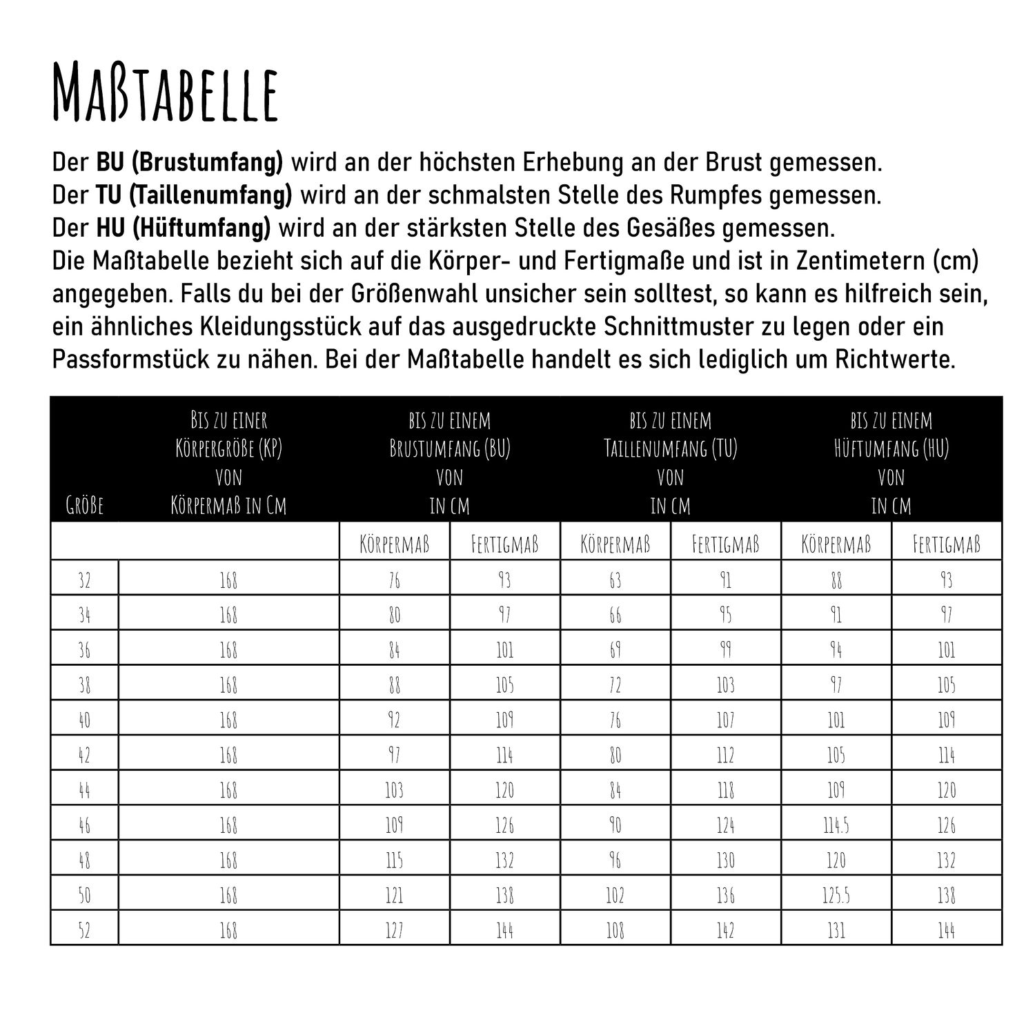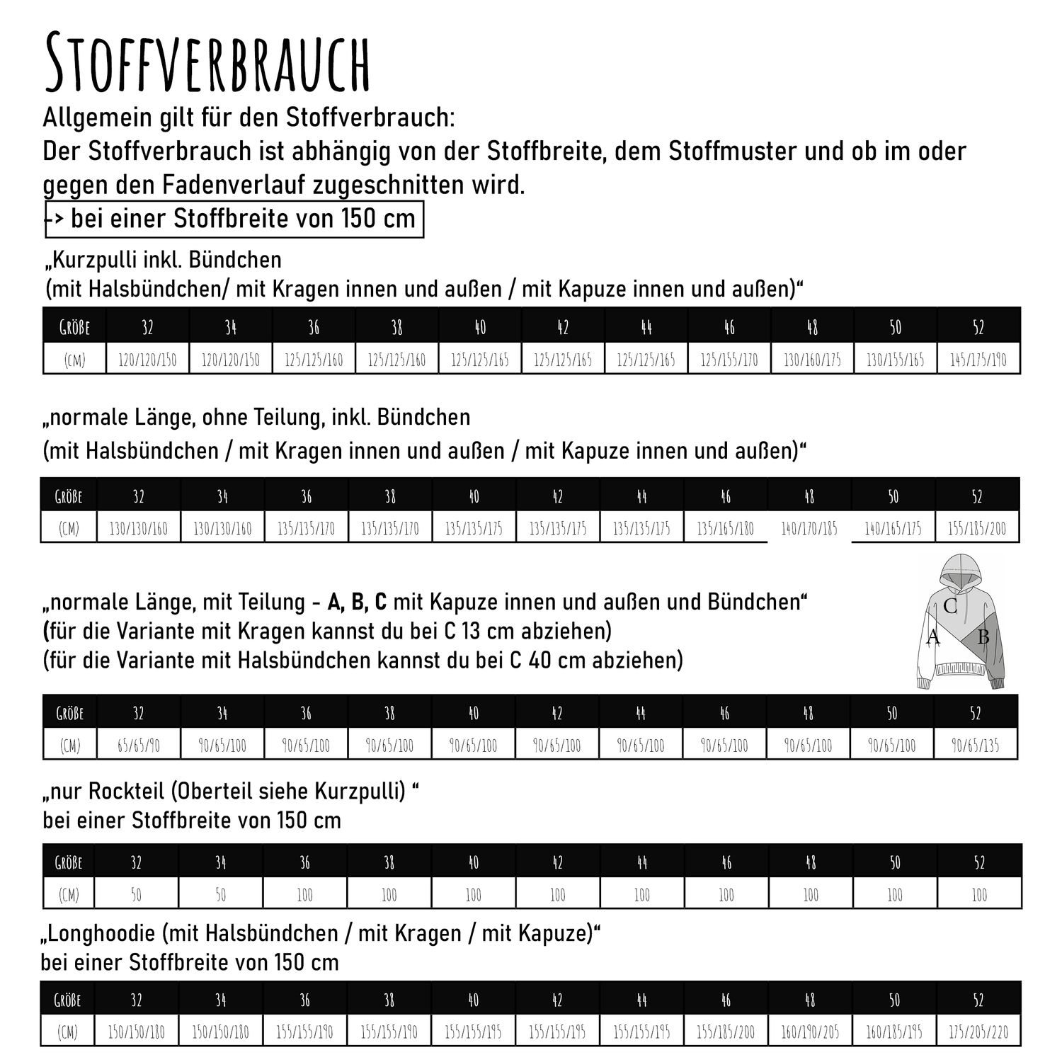Das E-Book beinhaltet das Schnittmuster in den Größen 32 - 52 (BU 74 cm - 124 cm, HU 86 cm - 131 cm) auf A4, A0 (jeweils einmal mit und einmal ohne enthaltener Naht- und