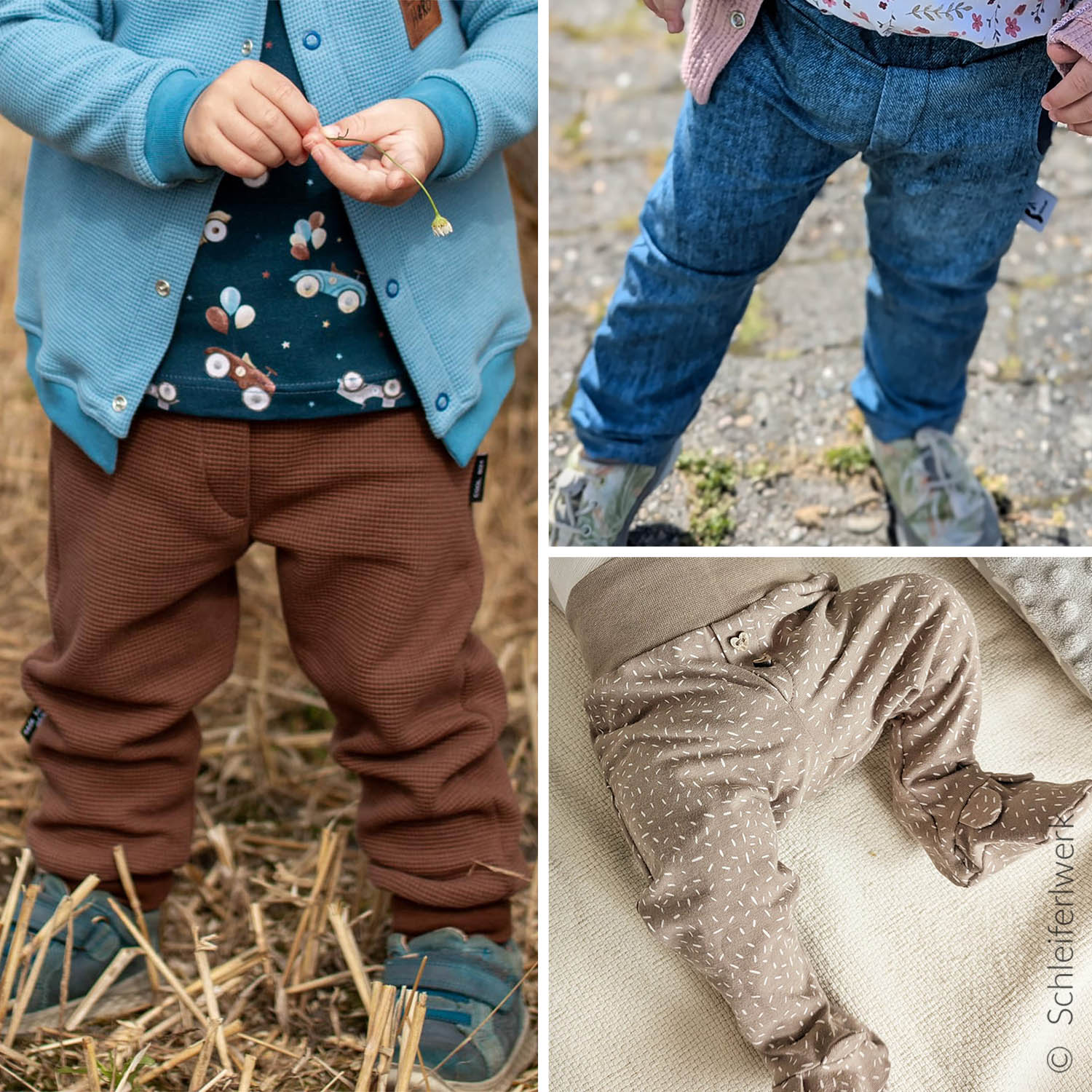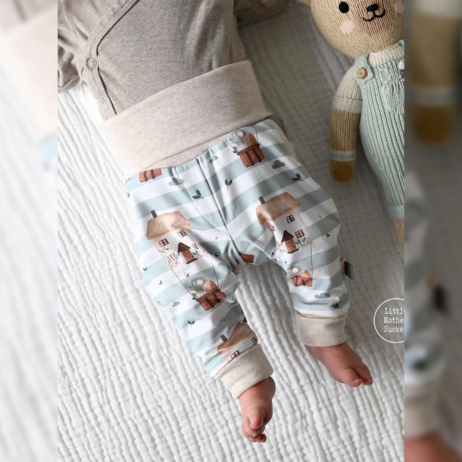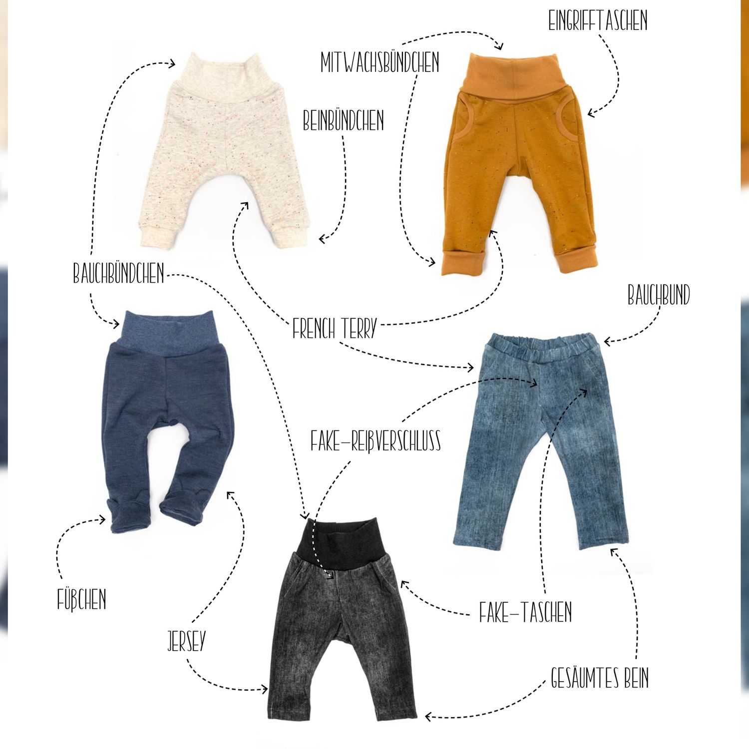 Die Happy Baby Pants ist für verschiedenste elastische Stoffarten geeignet. Am besten eignet sich French Terry. Du kannst aber z.B. auch Jersey oder Waffeljersey verwenden. Wichtig ist, dass der Stoff dehnbar ist. Für die Bündchen solltest du Bündchenware verwenden. Der Verbrauch ist mit einer Stoffbreite von 150 cm und einer Bündchenbreite von 70 cm berechnet.