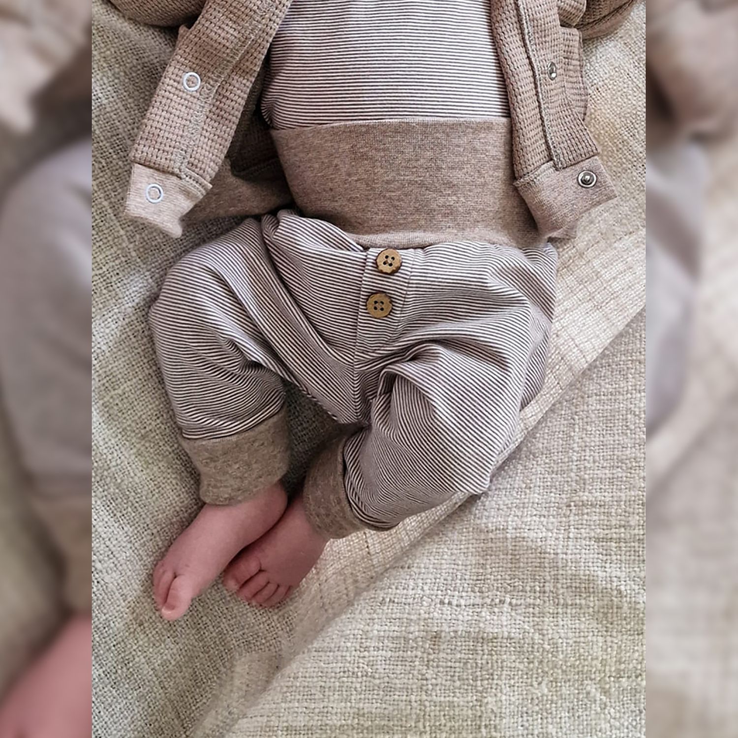 Der Happy Baby Strampler ist für elastische Stoffe ausgelegt. French Terry oder Waffeljersey eignen sich perfekt dafür. Du kannst aber auch Cordnicky oder Jacquard dafür verwenden. Die Rüsche und auch die Einfassung für die Knopfleiste sollten aus dünnen Stoffen zugeschnitten werden.