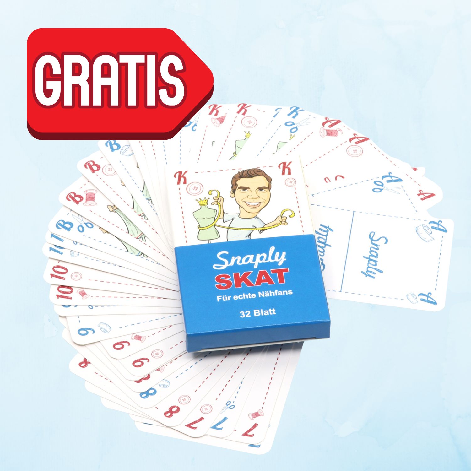 Ab einem Warenwert von 30 € erhältst Du dieses Skatspiel für Nähfans kostenlos zu Deiner Bestellung dazu. Du musst nichts tun. Es wird automatisch in Deinen Warenkorb gelegt.