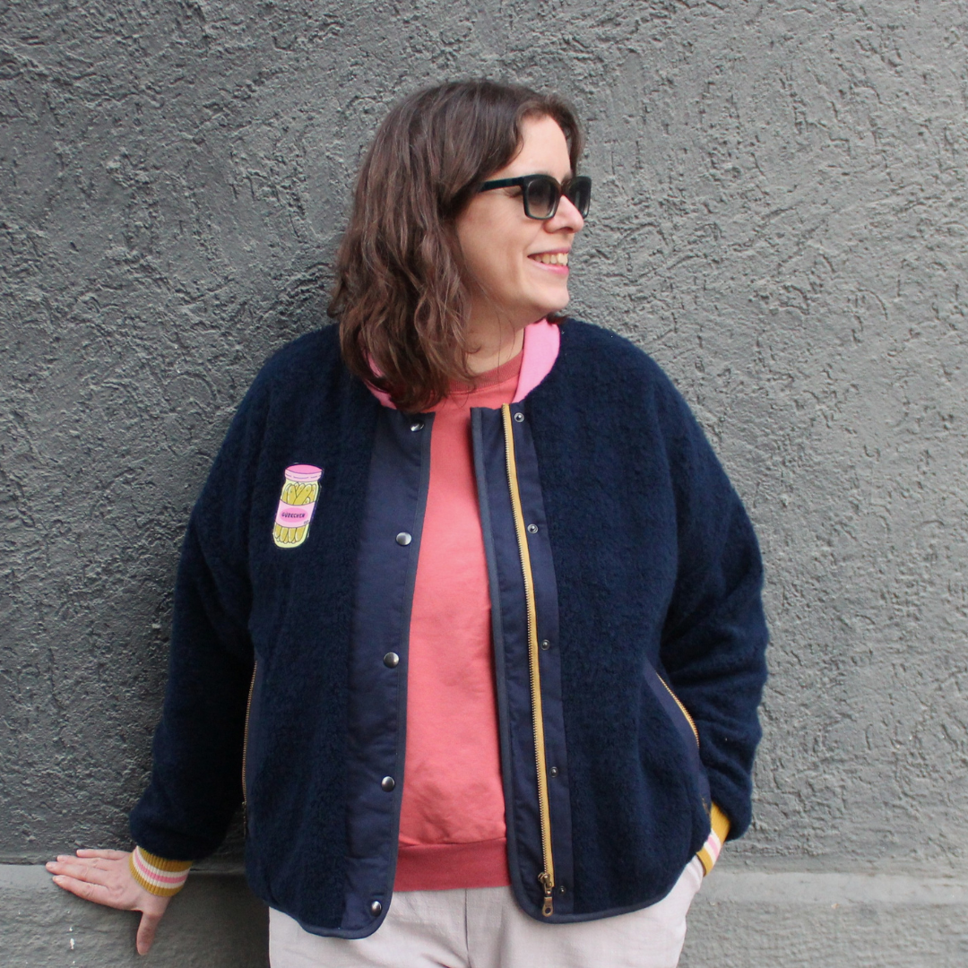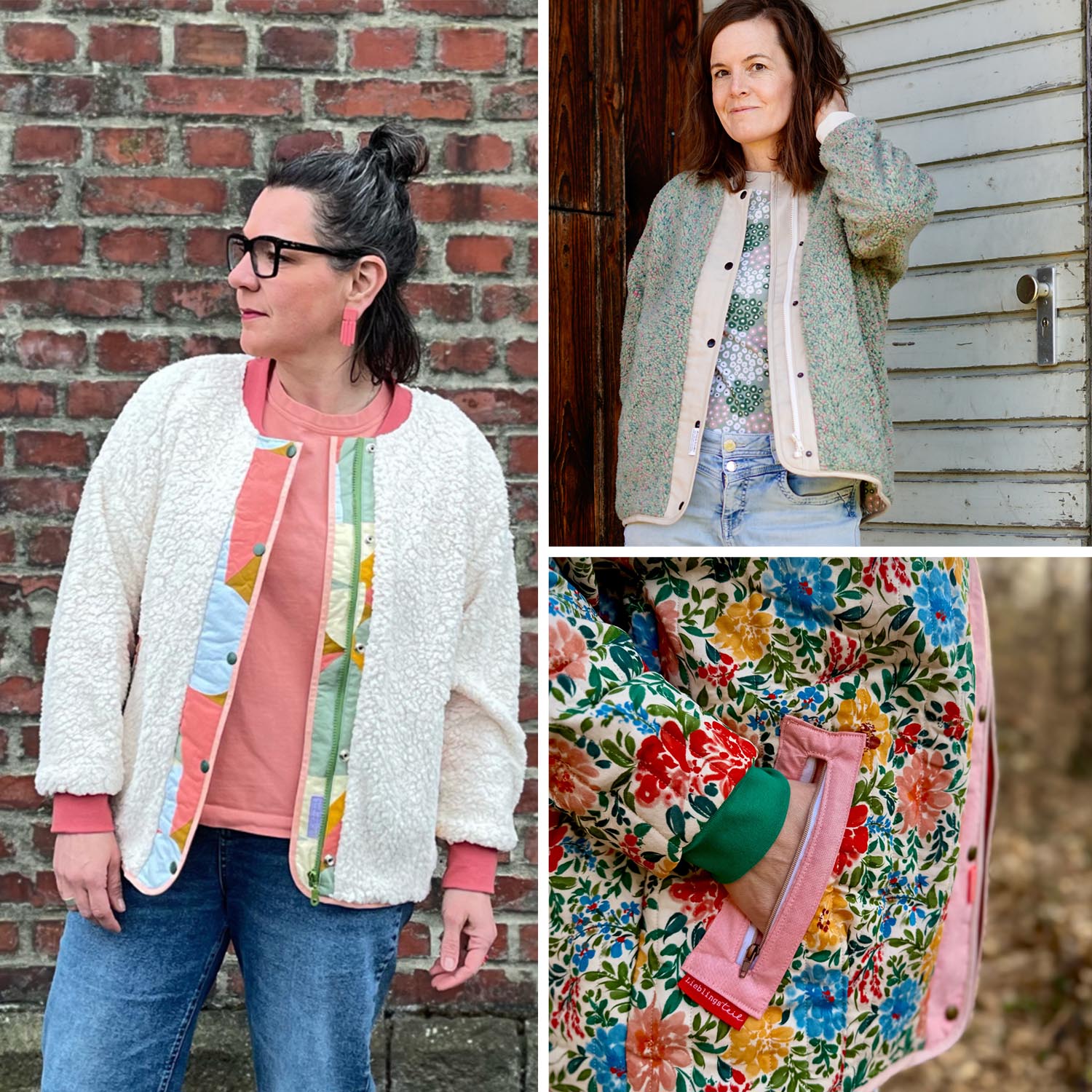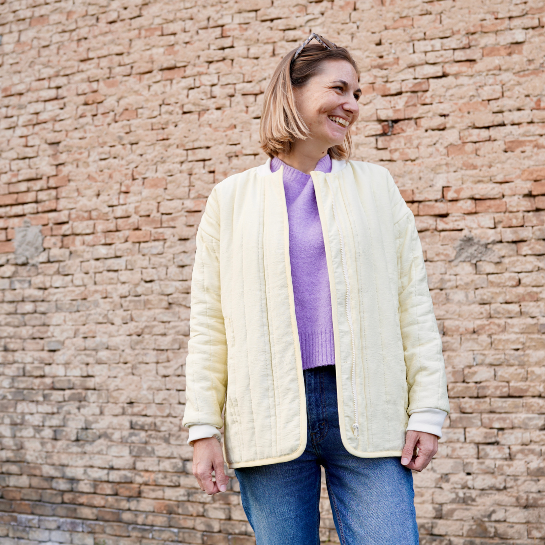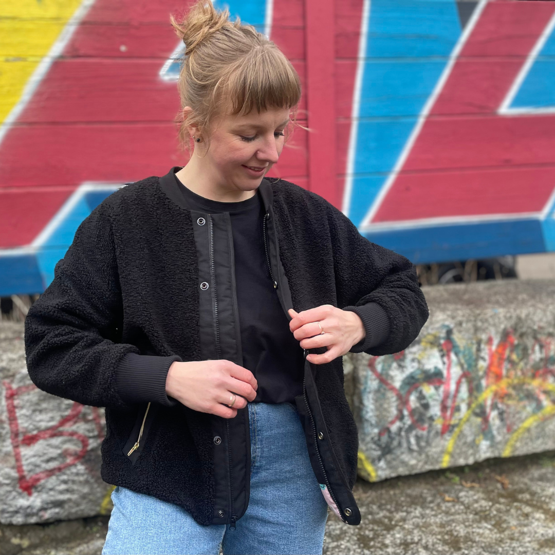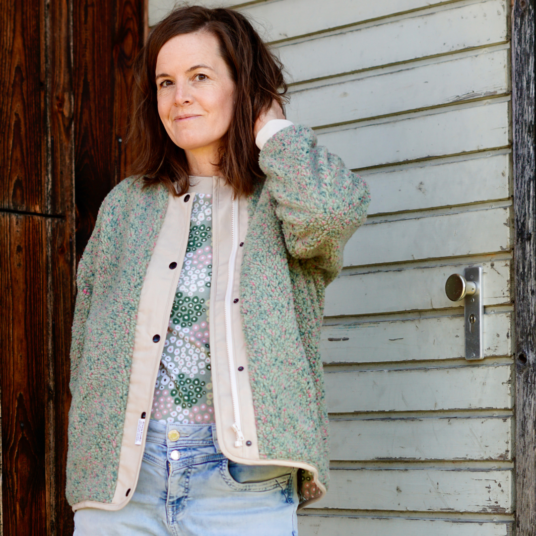 „Drumherum“ ist eine lässige Oversize-Übergangsjacke mit entspanntem Sitz. Der verdeckt eingearbeitete Reißverschluss sorgt für eine ruhige, reduzierte Optik. Dazu passend sind die abgesetzten Reißverschlusstaschen außen. Innen gibt es außerdem eine weitere Innentasche. Eine Jacke für jeden Tag. Zum Überziehen, Wohlfühlen und eben einfach drumherum.