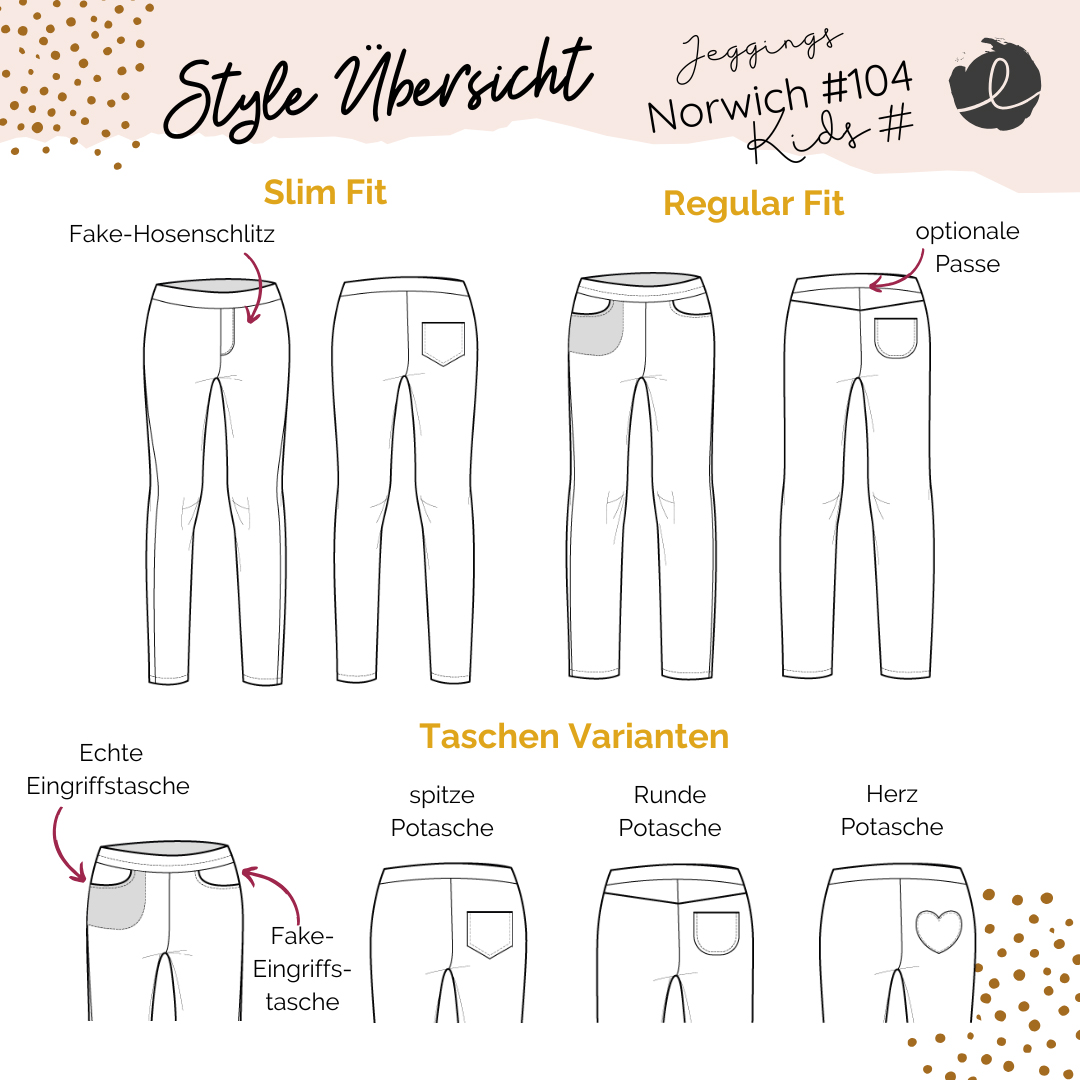 Die Jeggings Norwich #104 ist ein Schnittmuster für eine coole und bequeme Jeggings für Kids in den Größen 74 – 164.
