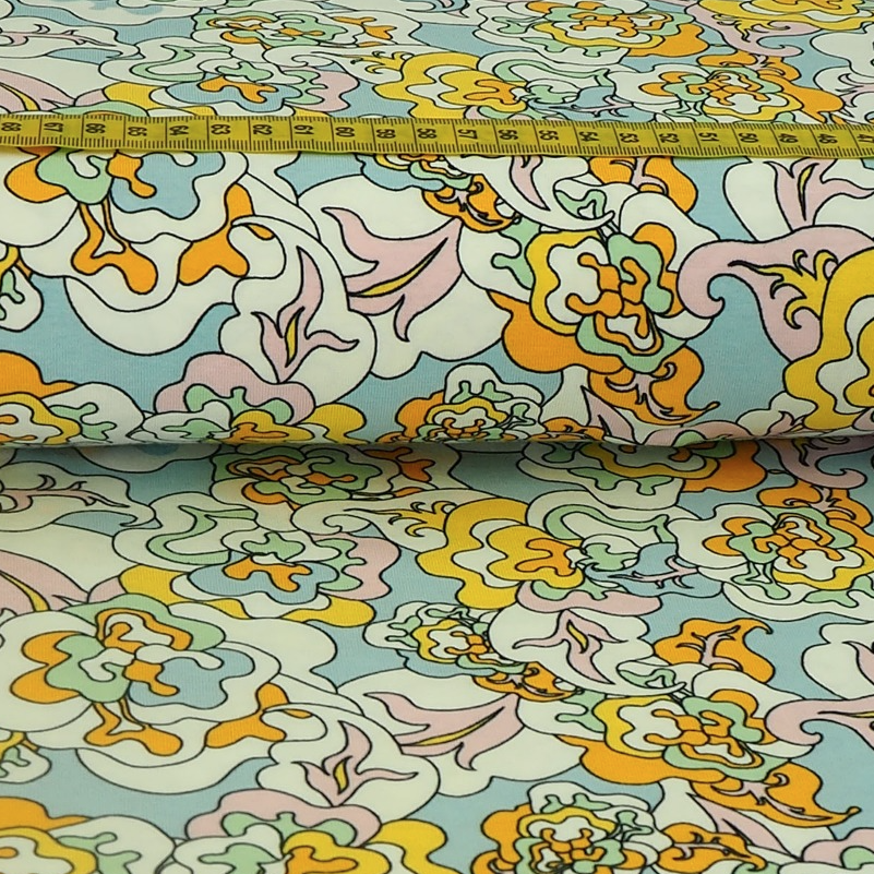 Jersey Camouflage Blumen Gelb auf Hellblau