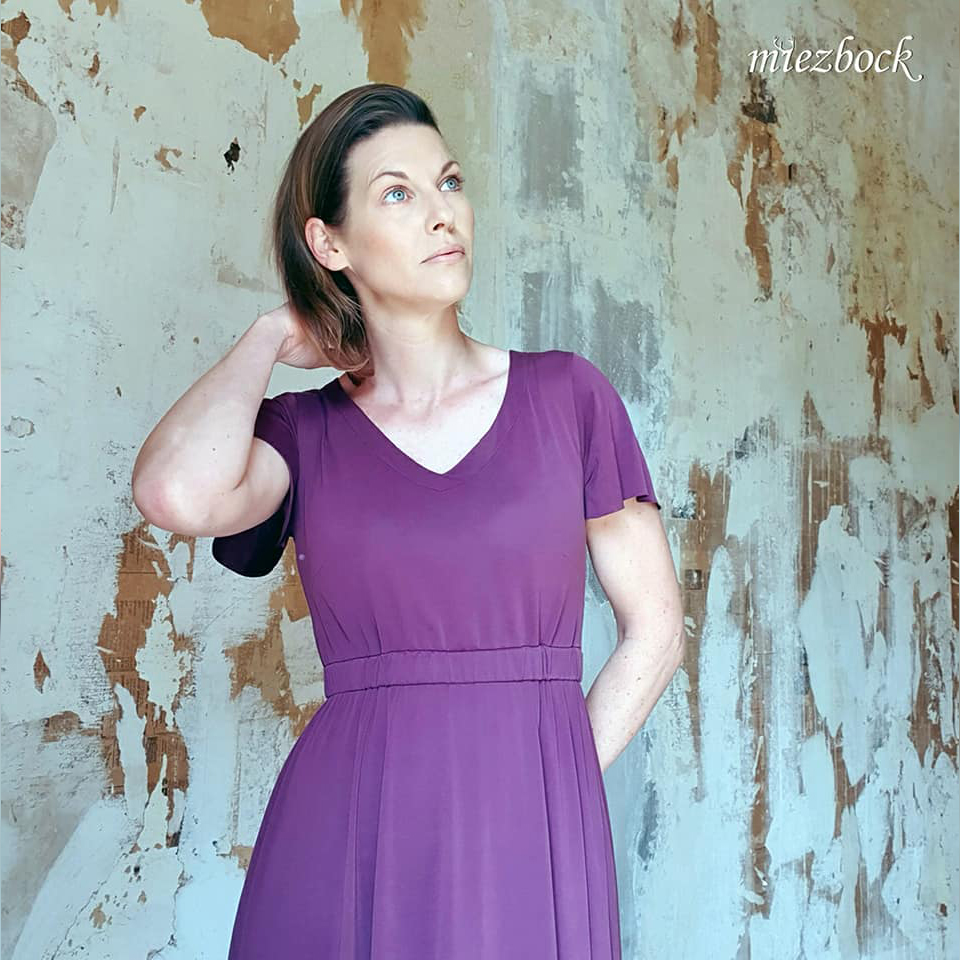 - Hertha wird aus Jersey genäht, besonders gut eignen sich leicht fallende Viskose- oder Modal-Jerseys. Diese sind besonders für die Flatterärmel zu empfehlen. Schlichte Kleider mit normalen oder Kapp-Ärmeln lassen sich auch prima aus einfachem Baumwoll-Jersey nähen.