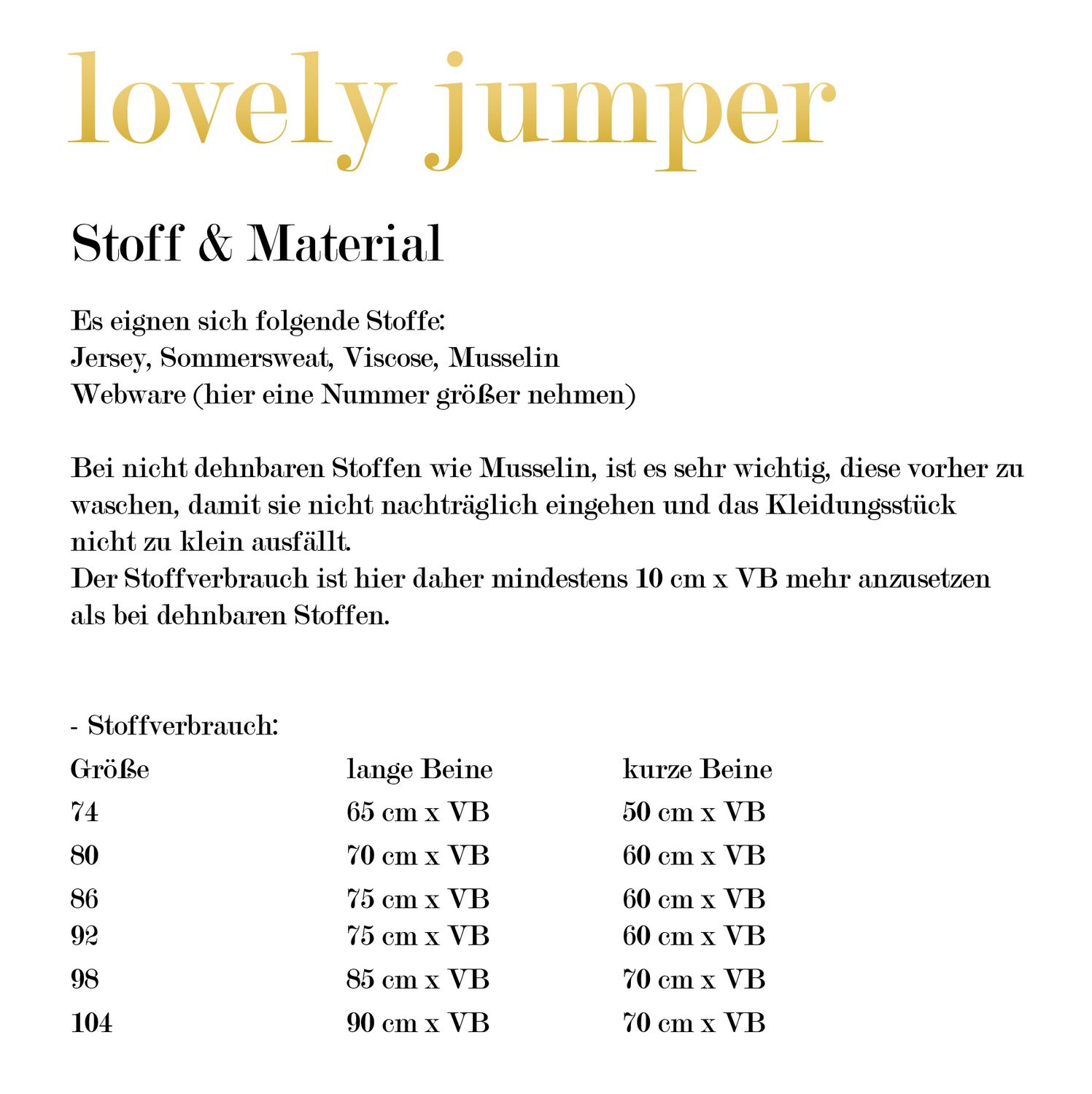 lovely jumper ist ein für den Sommer und Herbst geeigneter Jumpsuit, welcher mit unterschiedlichen Stoffen genäht werden kann.