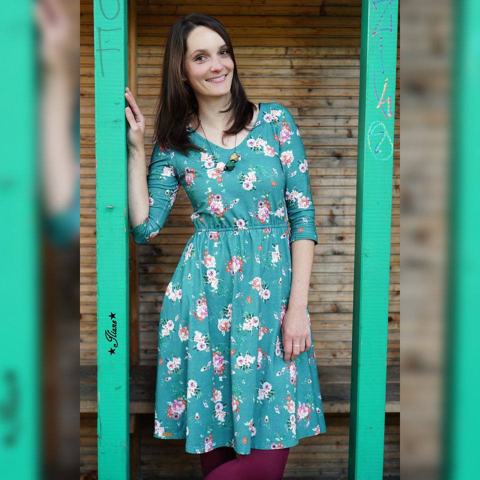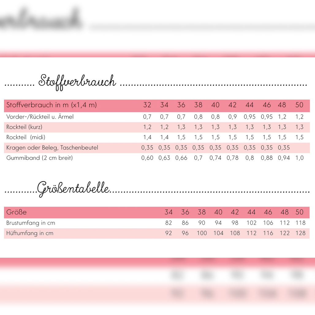 Bertha wird aus leichten, dehnbaren Stoffen genäht, besonders gut eignen sich schön fallende Viskose- oder Modal-Gemische: z. B. Modalsweat- oder Jersey, Viskosejersey sowie Strickstoffe. Diese sind besonders für die weiten Ärmeln und den Kragen zu empfehlen. Schlichte Kleider mit normalen Ärmeln und Beleg lassen sich auch prima aus einfachem Baumwoll-Jersey oder leichtem Sommersweat nähen.