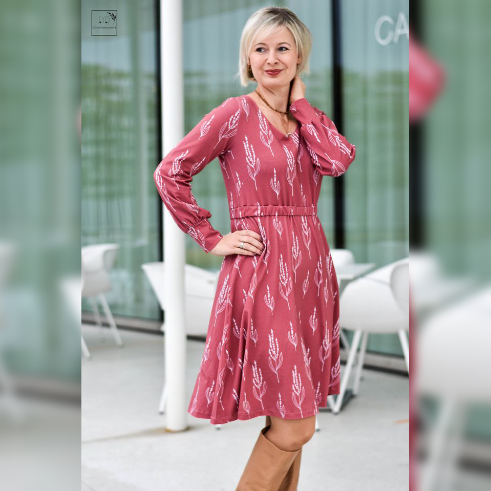 In der winterlichen Version kannst du dein Kleid mit einem wasserfallartigen Kragen im V-Ausschnitt sowie leicht fallenden, weiten Ärmeln nähen. Du kannst dein Kleid auch mit normalen langen oder 3/4-langen Ärmeln sowie einem Beleg im Ausschnitt nähen! Der leicht abgerundete V-Ausschnitt verleiht dem Dekolleté eine besonders schöne Form und macht das Kleid zu einem echten Hingucker. Der figurformende Gummizug in der Taille und das locker sitzende Oberteil machen die Bertha zu einem super bequemen Lieblingskleid! Das Schnittmuster "Bertha" enthält die Größen 32–50!