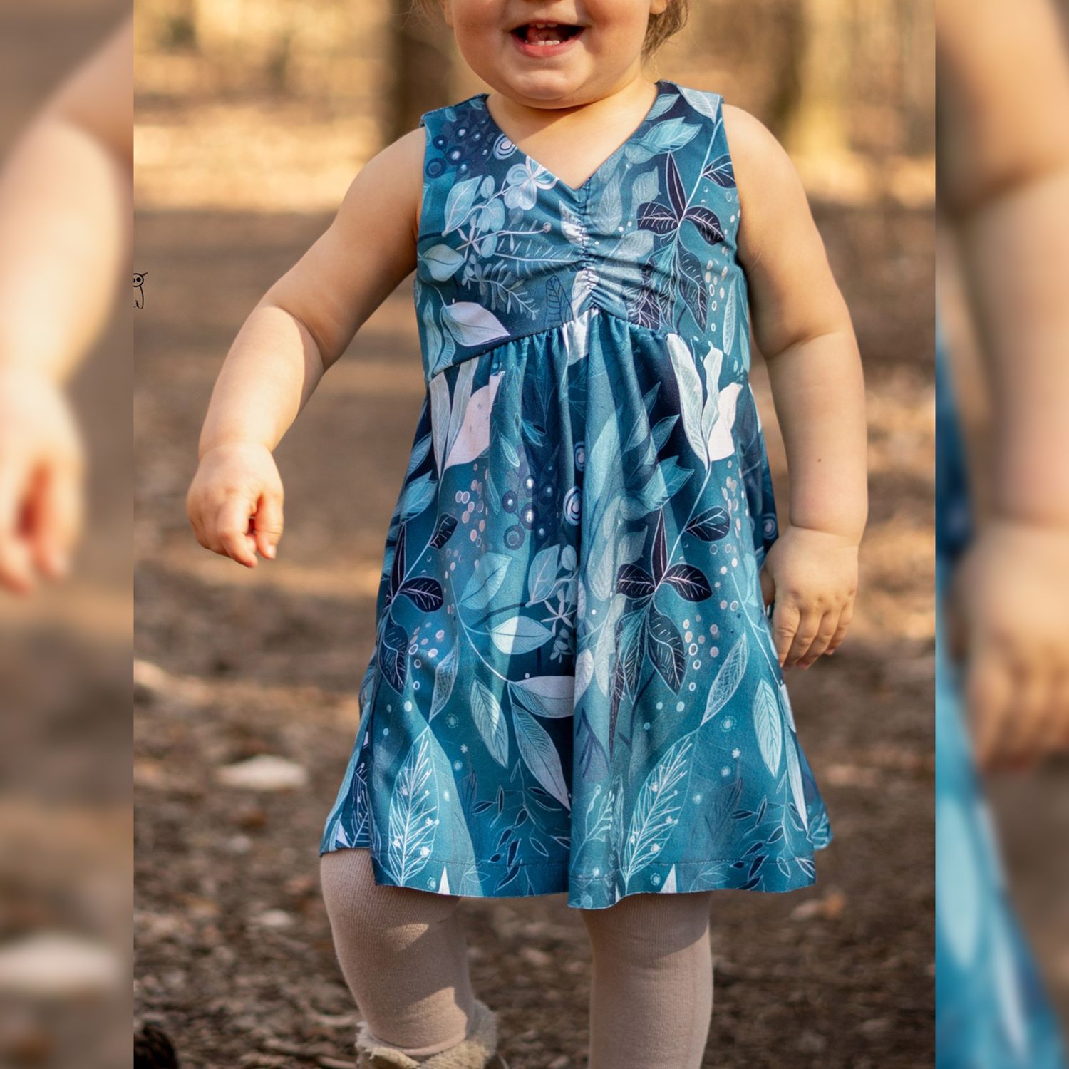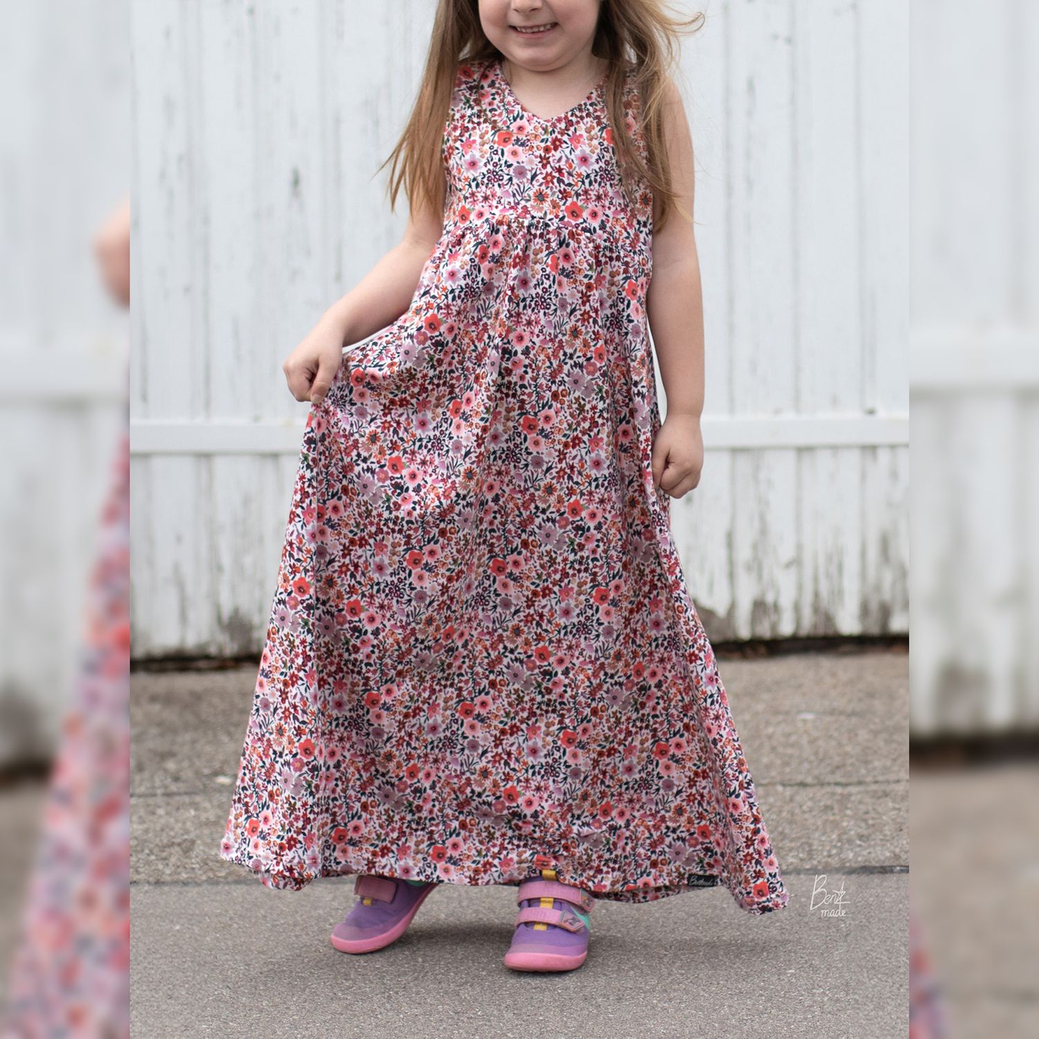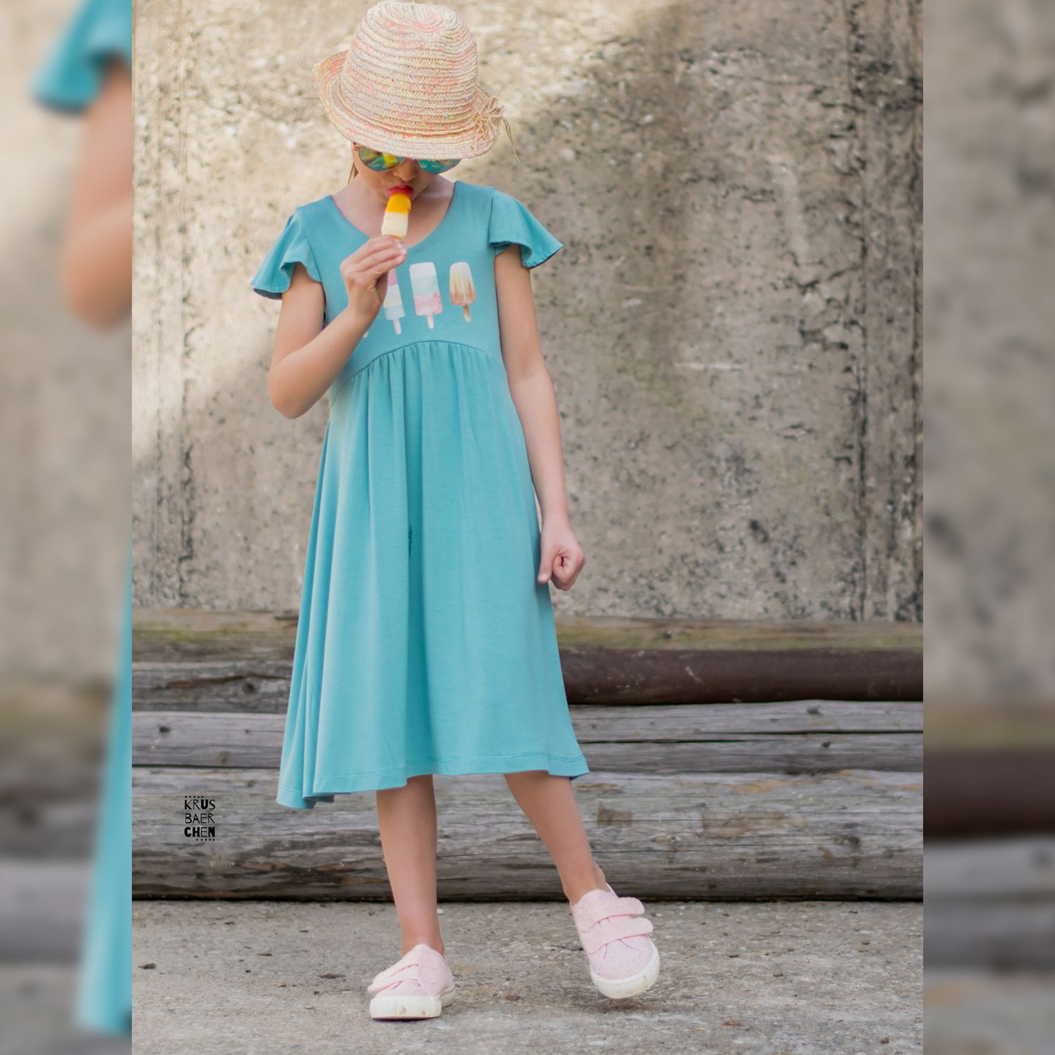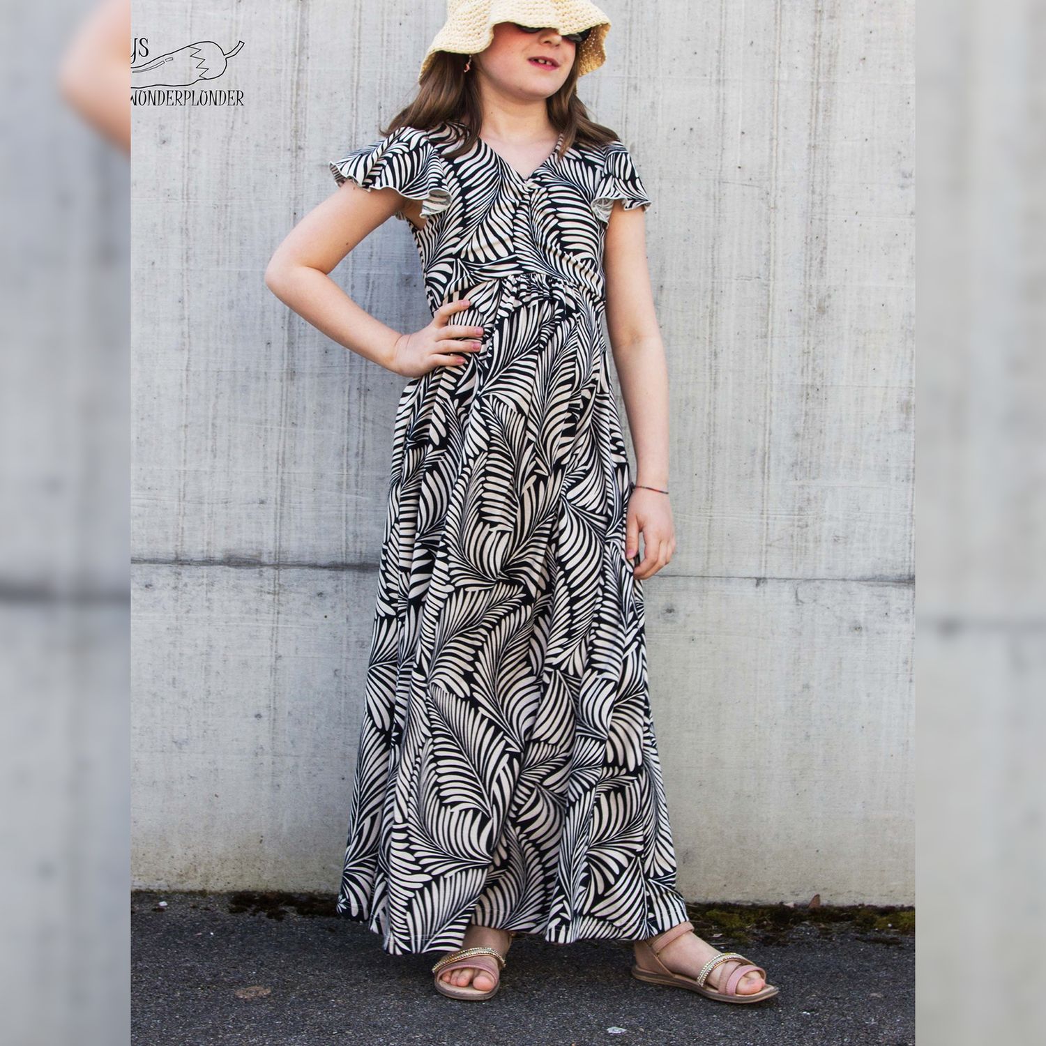Das Dreamy Dress ist ein luftiges Sommerkleid für Kinder. Du kannst es mit gerafftem oder ungerafftem Vorderteil und in zwei verschiedenen Längen nähen. Das Rockteil kann nach Belieben ebenfalls gerafft werden. Es wird entweder ärmellos oder mit Flatterärmeln genäht. Optional können Nahttaschen hinzugefügt werden. Das Schnittmuster ist für NähanfängerInnen geeignet.