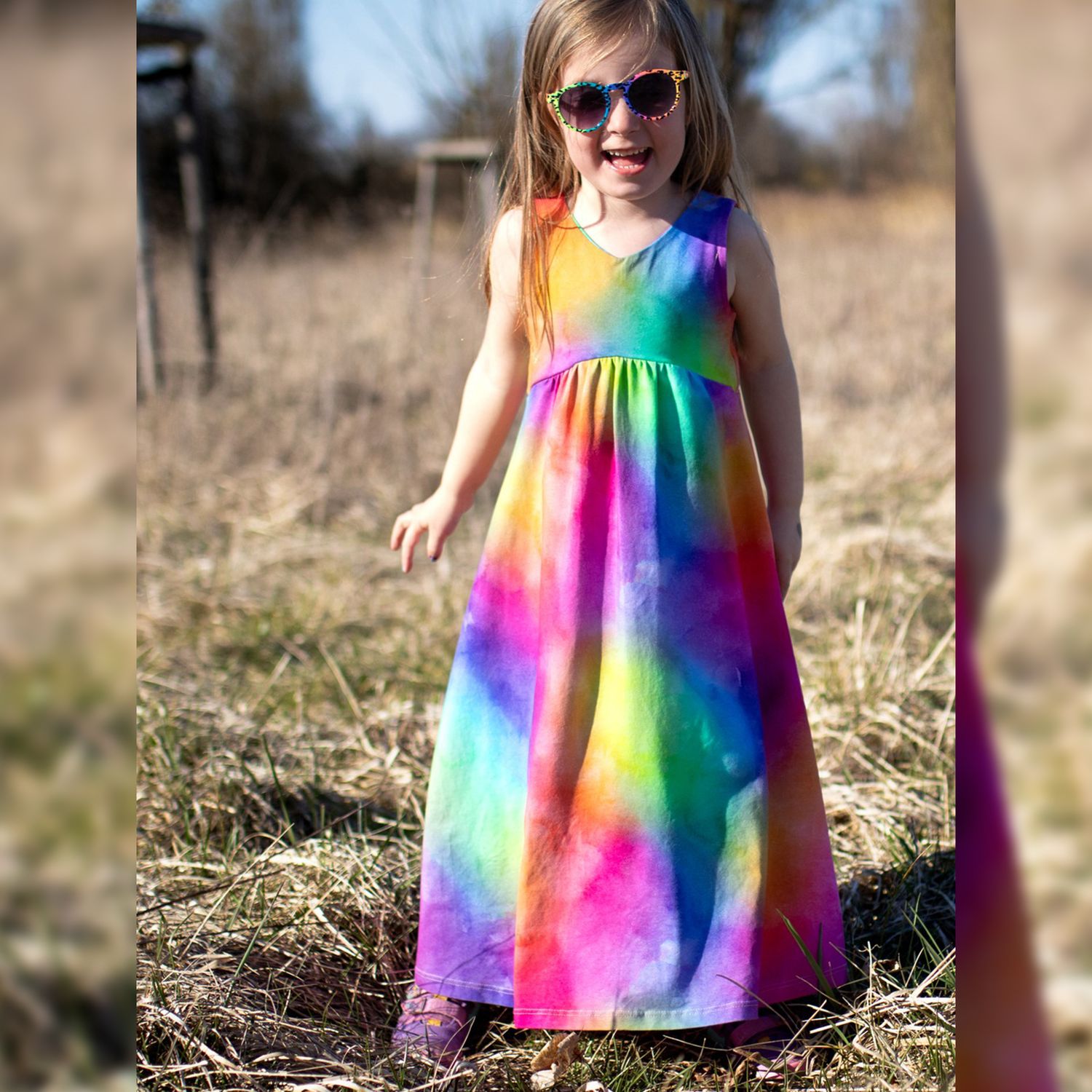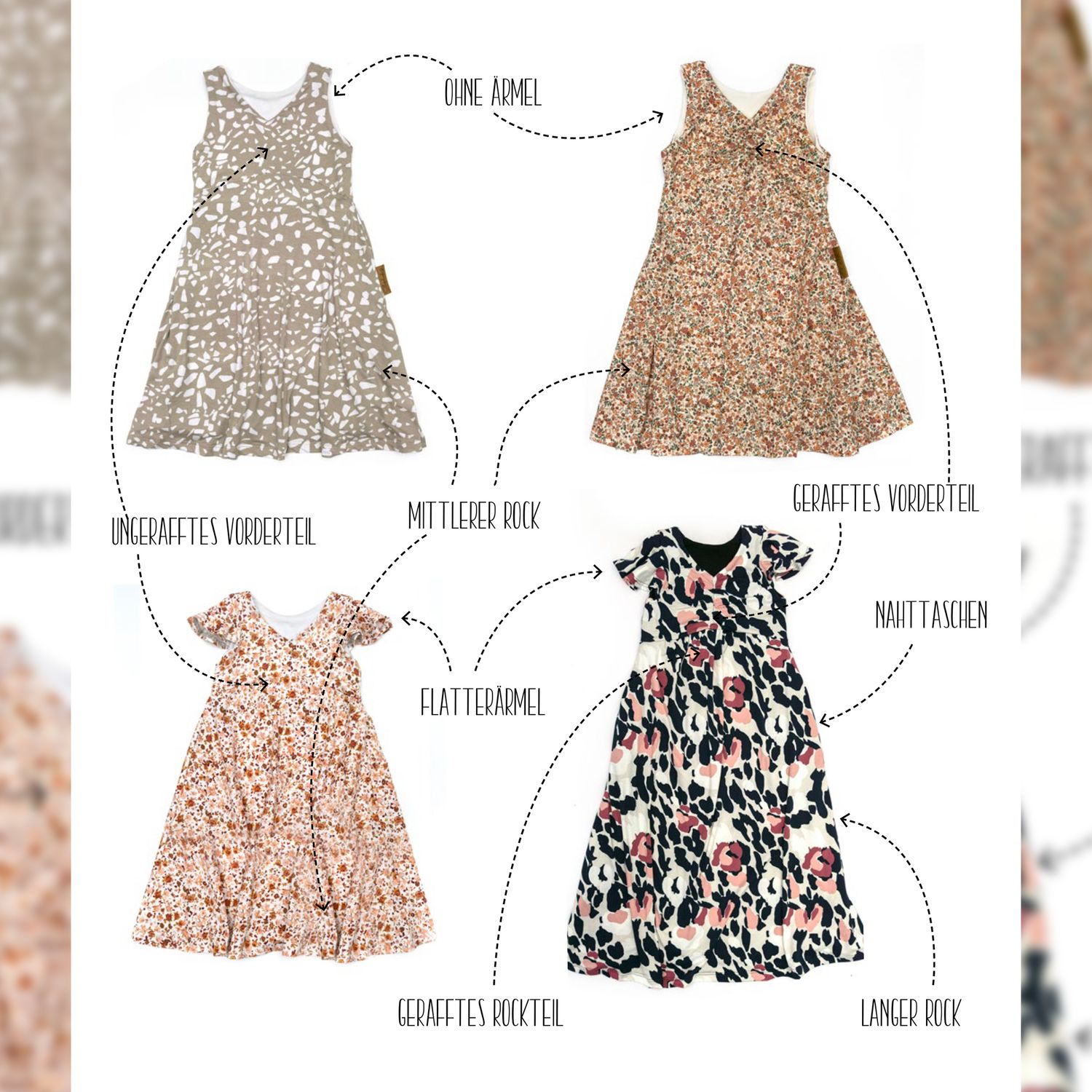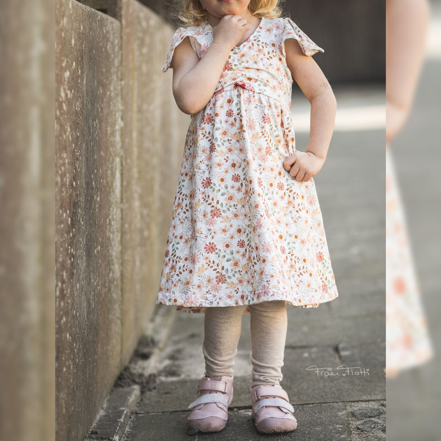Das Dreamy Dress ist ein luftiges Sommerkleid für Kinder. Du kannst es mit gerafftem oder ungerafftem Vorderteil und in zwei verschiedenen Längen nähen. Das Rockteil kann nach Belieben ebenfalls gerafft werden. Es wird entweder ärmellos oder mit Flatterärmeln genäht. Optional können Nahttaschen hinzugefügt werden. Das Schnittmuster ist für NähanfängerInnen geeignet.