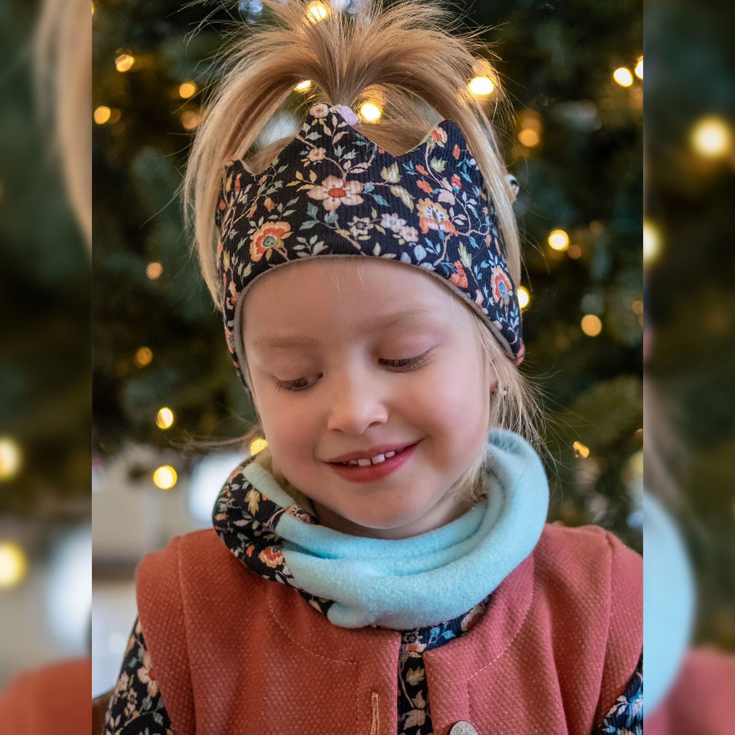 Das Kronenstirnband ist für elastische Stoffe wie Jersey, French Terry oder auch Fleece ausgelegt. Wenn du sehr elastische Stoffkombis wie z.B. Rippjersey und Fleece benutzt, kannst du eine Größe kleiner nähen. Der Außenstoff sollte nach Möglichkeit dicker als der Innenstoff sein, damit die Zacken auch gut stehen.