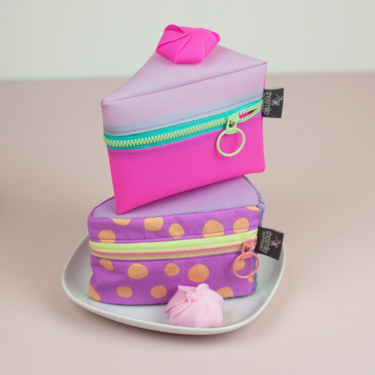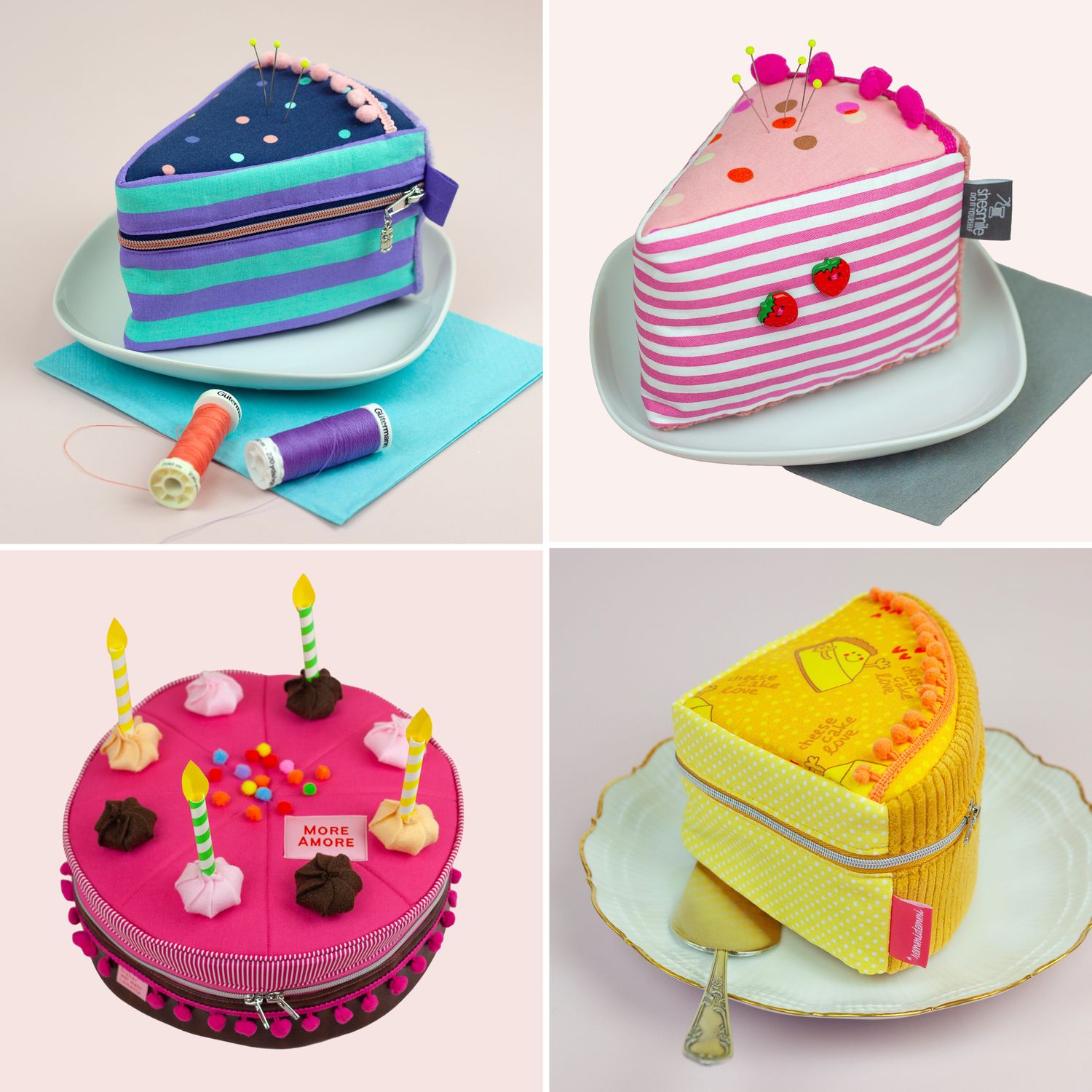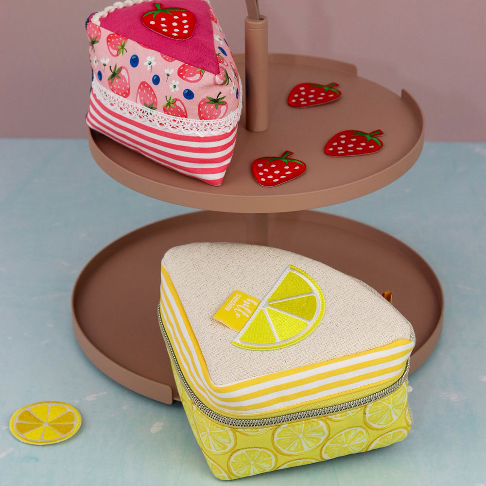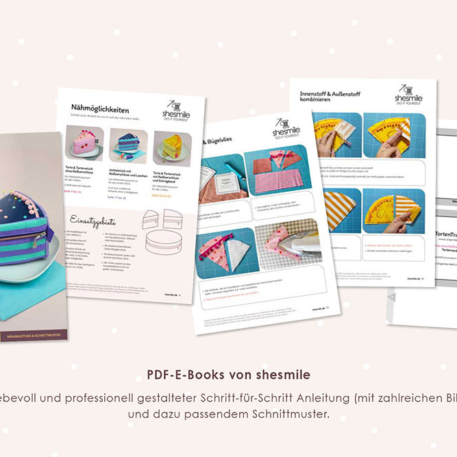 Und wie du es von shesmile kennst, stecken natürlich auch in diesem Schnittmuster wieder jede Menge kreative Zusatzfunktionen: Nähe die Torte oder einzelne Stücke mit Reißverschluss und verwandle sie so in eine praktische Aufbewahrung oder eine ganz besondere Verpackung für Geschenke und Süßkram. Auch lassen sich hier prima Backförmchen, Streusel oder Nähzubehör verstauen. Die ganze Torte ist eine prima Hülle für eine Springform in ø 26 cm Größe. Das Viertel ist eine ideale Aufbewahrungstasche für das Mini-Bügeleisen von Prym.