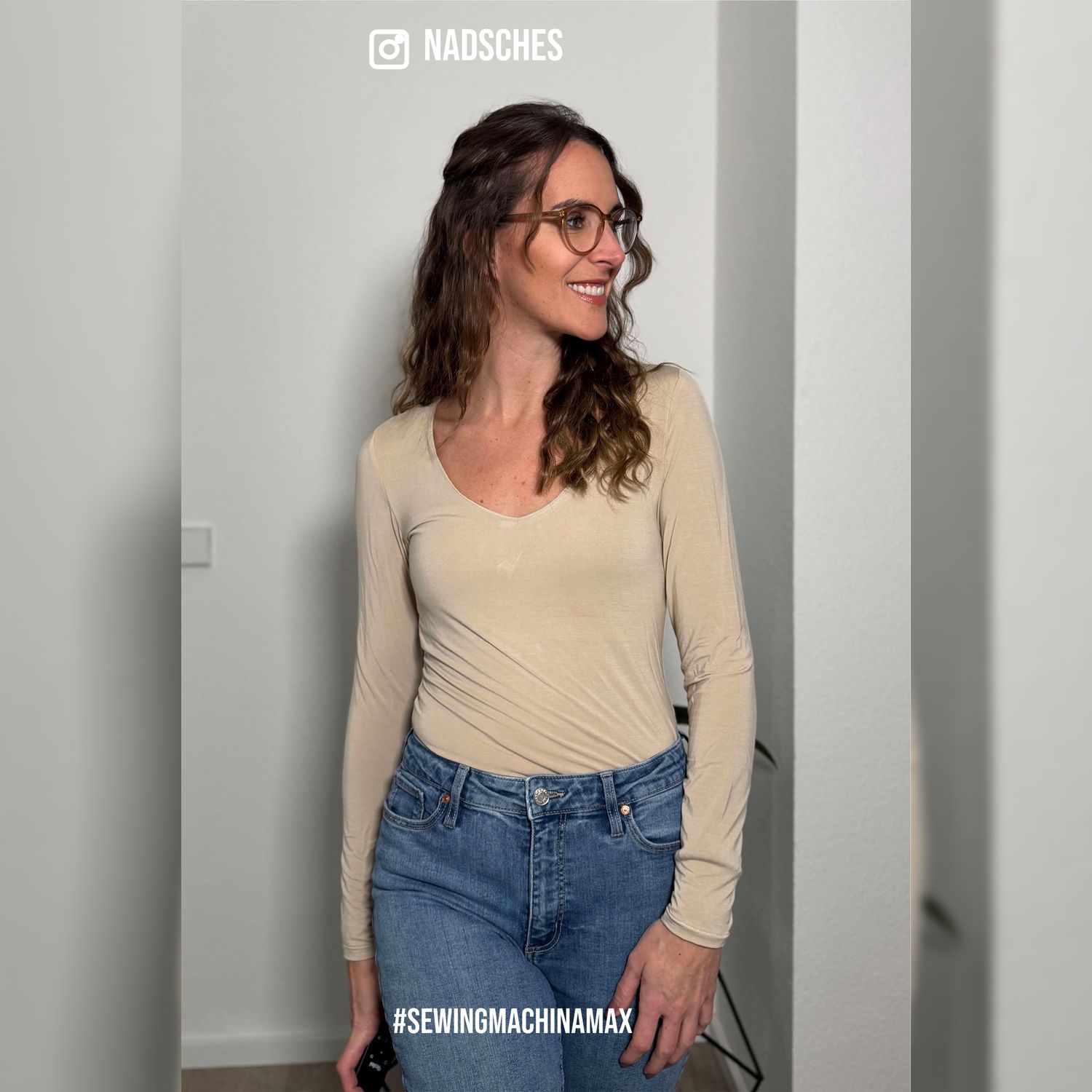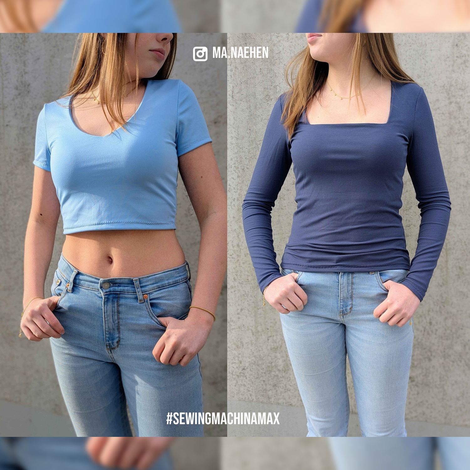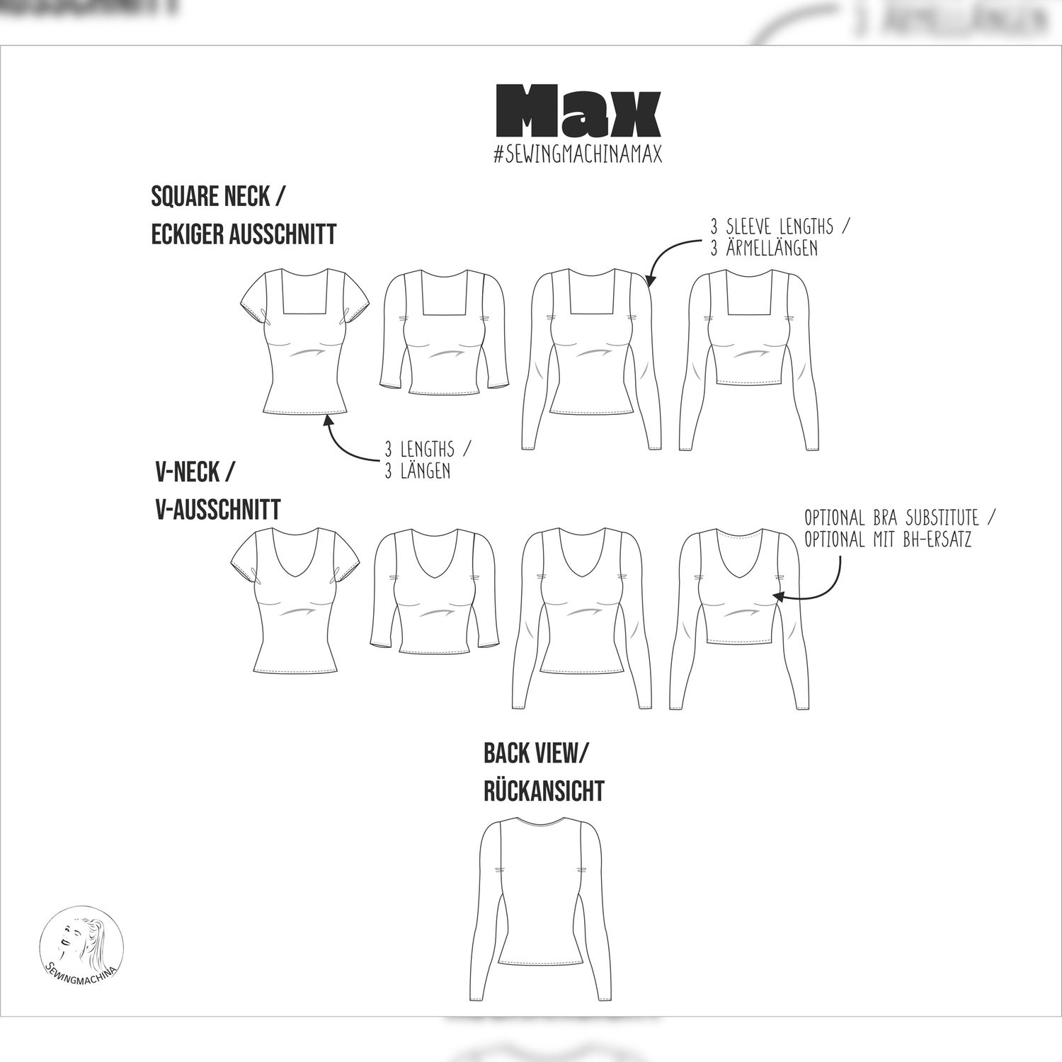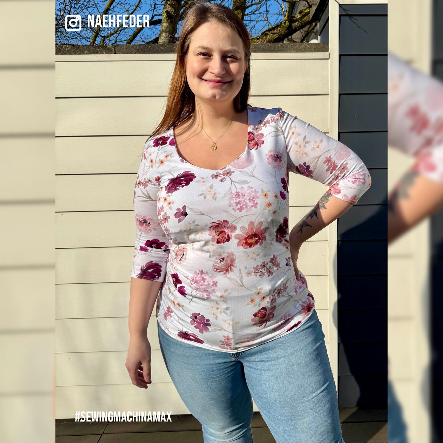 Näh dir mit diesem Schnittmuster dein perfektes Basicshirt! Wähle zwischen V-Ausschnitt oder eckigem Ausschnitt, sowie 3 verschiedenen Längen und Ärmellängen. Für Max eignen sich alle Arten von Jersey mit einem Stretchfaktor von 70-90%, wie z.B. Viskose- oder Bambusjersey, Lycra, Rippjersey, dünne Baumwolljerseys etc. (Dieser Stretchfaktor bedeutet, dass du deinen Stoff auf seine 1,7 bis 1,9-fache Breite dehnen kannst)