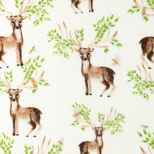 Musselin Blätterhirsch mit Vögelchen auf Creme Digital
