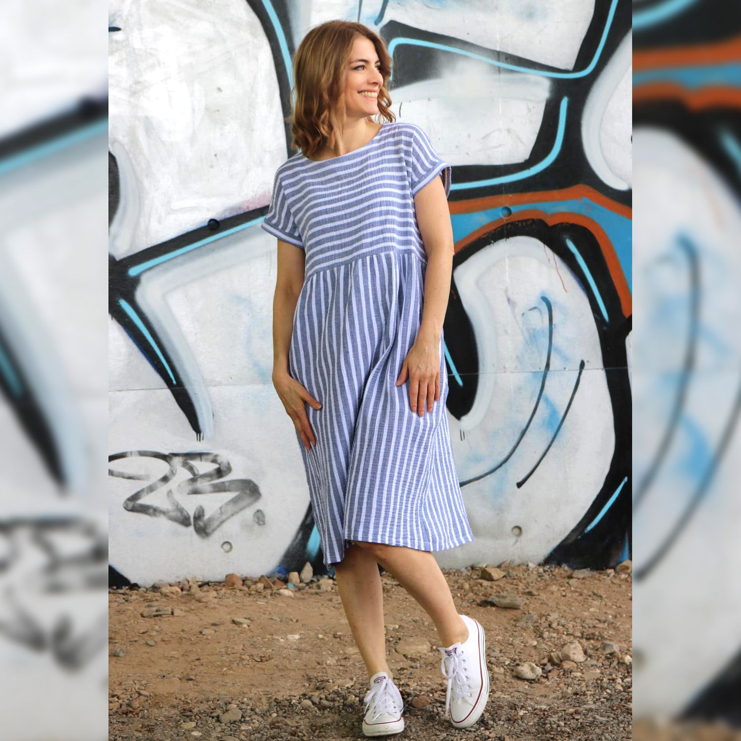 Liese ist ein Schnittmuster für ein lässiges Damen-Kleid aus Webware, wie Musselin, Leinen oder Viskose – eben alles was Frau im Sommer gerne trägt!