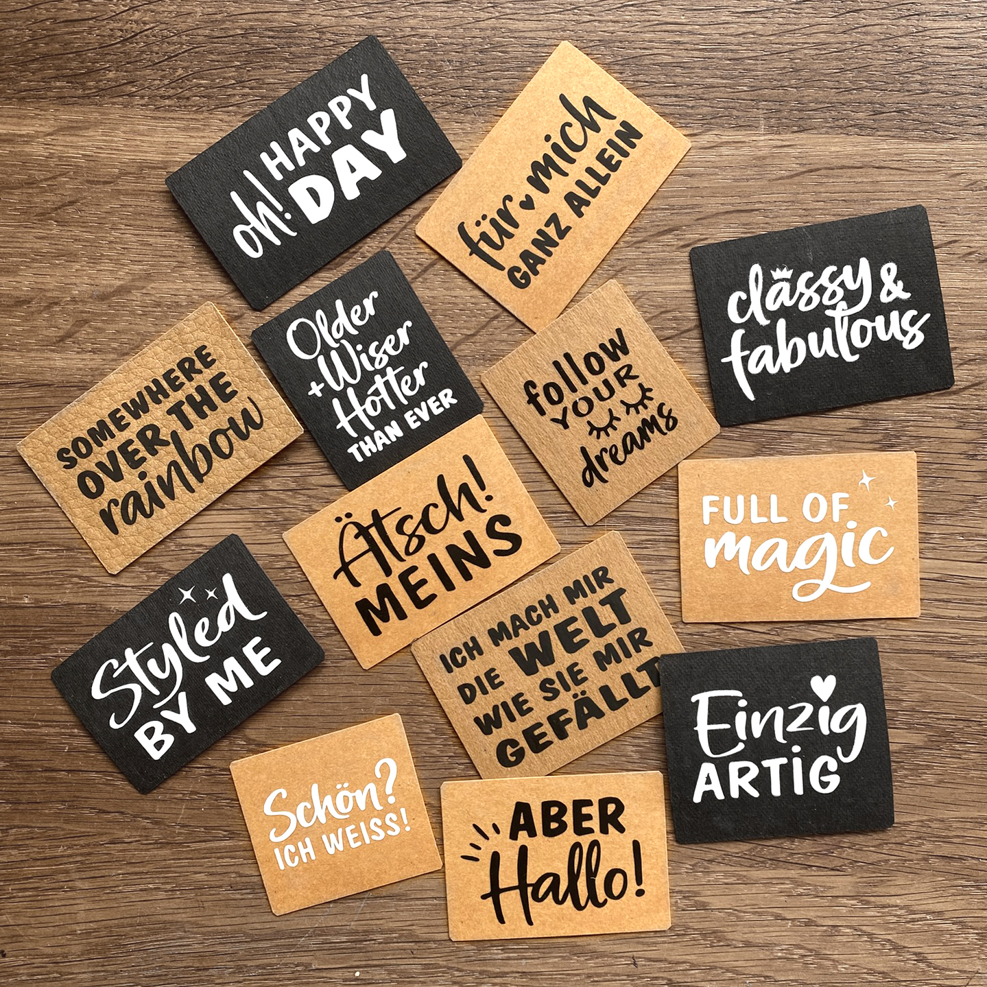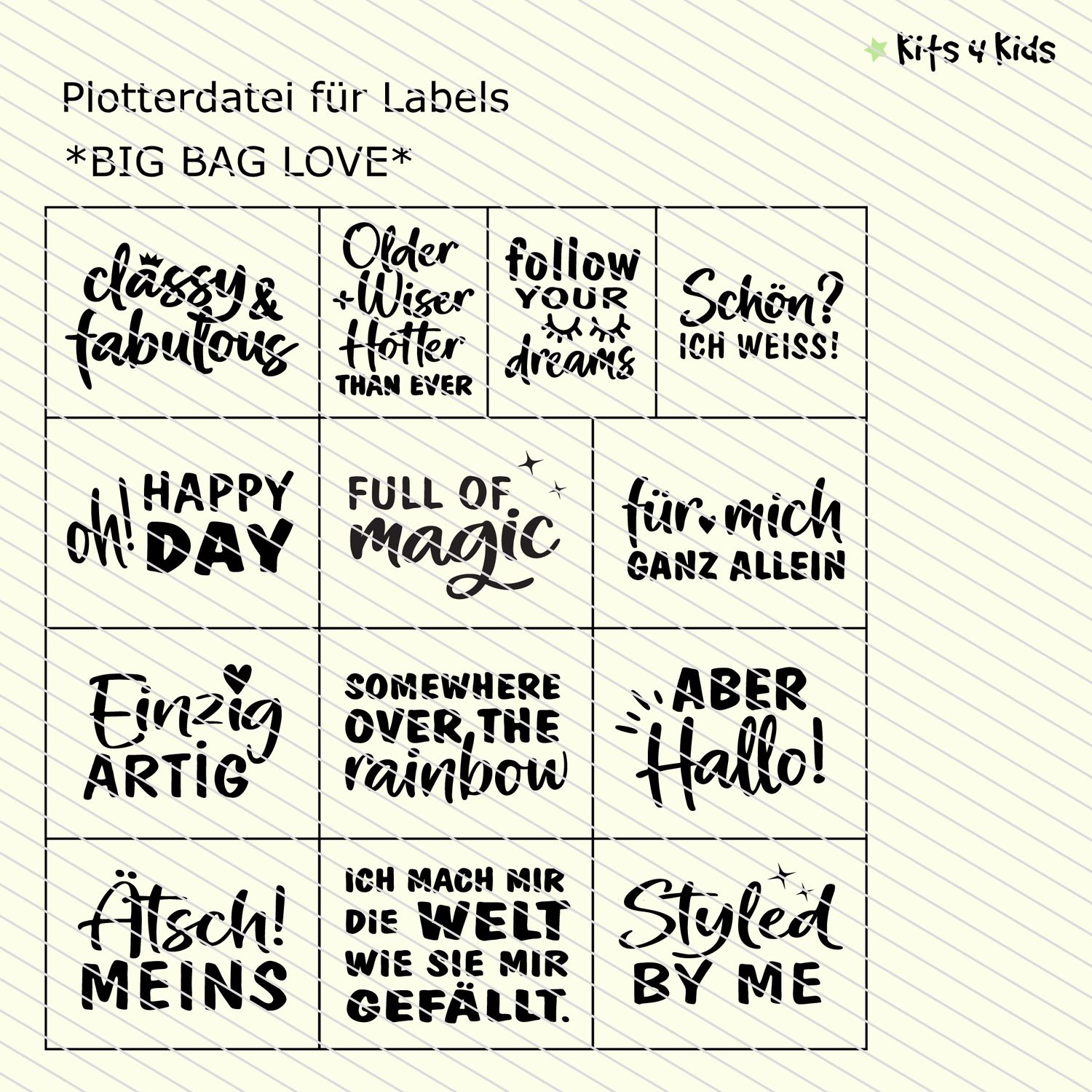 Die "BigBagLove"-Labels enthalten eine Plotterdatei-Serie aus 13 pfiffigen Schriftzügen zum Aufpeppen deiner selbstgenähten Taschen/Accessoires. Die einfärbigen Motive werden mit Flexfolie (gespiegelt) geplottet und auf Snappap oder Lederlabels aufgebügelt. Die Größe der Datei ist dabei variabel (Labelgröße ab ca. 5 cm Breite).